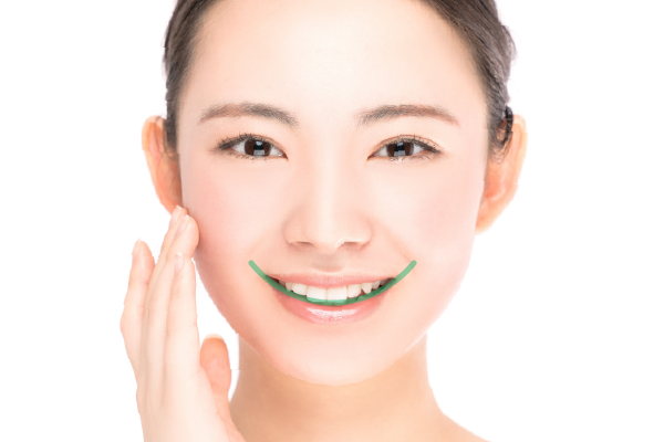 「スマイルライン」とは、上前歯の先端を線で結んだ笑顔時における美的ラインのことです。口元が人の第一印象を決めるため、スマイルラインが美しく描かれているかどうかは、顔全体の印象を大きく左右します。スマイルラインは、下唇のカーブに沿ってゆるやかな曲線を描いていると、笑顔時に女性らしい雰囲気が生まれ、明るく魅力的な印象を与えます。美しいスマイルラインを持つ女優やモデルも多く、彼女たちの魅力はその一つにあります。スマイルラインは、歯並びや口元のバランスを改善することで整えることができます。さらに、お顔の中心と前歯の中心が揃うようにするとより美しく整った印象となります。