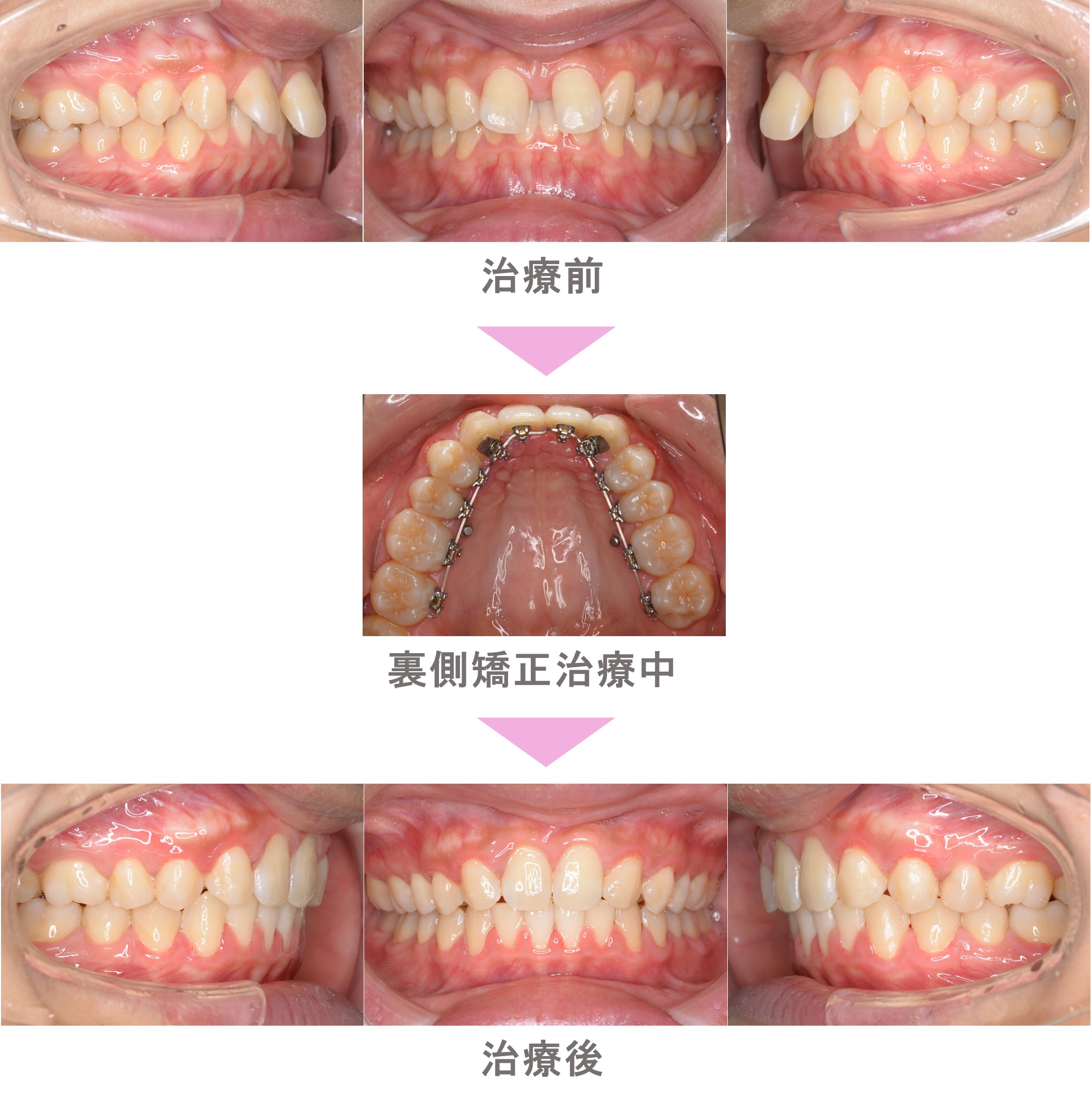 裏側矯正(舌側矯正)の症例のご紹介です。この患者様は、東京都昭島市からご来院の20代女性で、すきっ歯(空隙歯列)と過蓋咬合(深噛み)の症状がありました。治療法は裏側矯正(舌側矯正)。上顎前歯が2本欠損していたため、そのスペースを利用して、治療しました。過蓋咬合も改善され綺麗になりました。治療期間は1年6か月です。