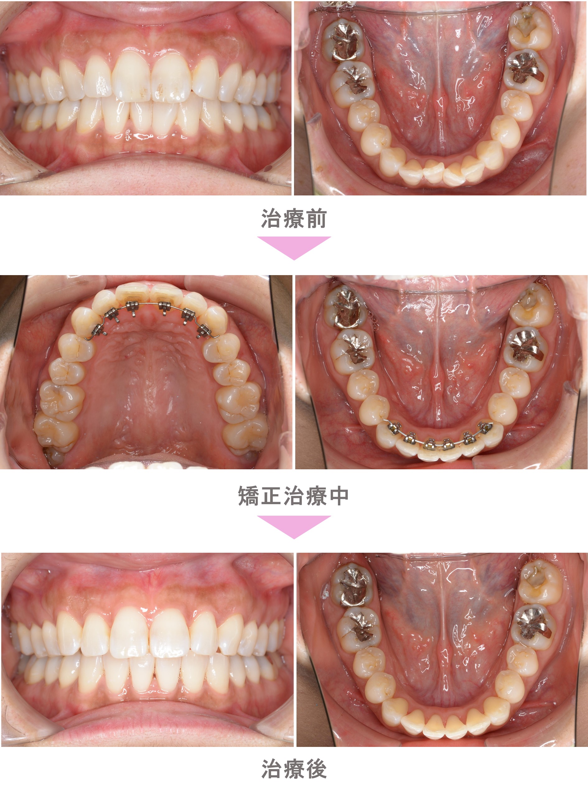 部分矯正(プチ矯正)・裏側矯正(舌側矯正)の症例紹介|叢生(前歯のでこぼこ)の症状|非抜歯による矯正治療|治療期間は9か月(東京都世田谷区・30代女性 )
