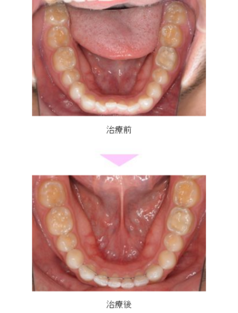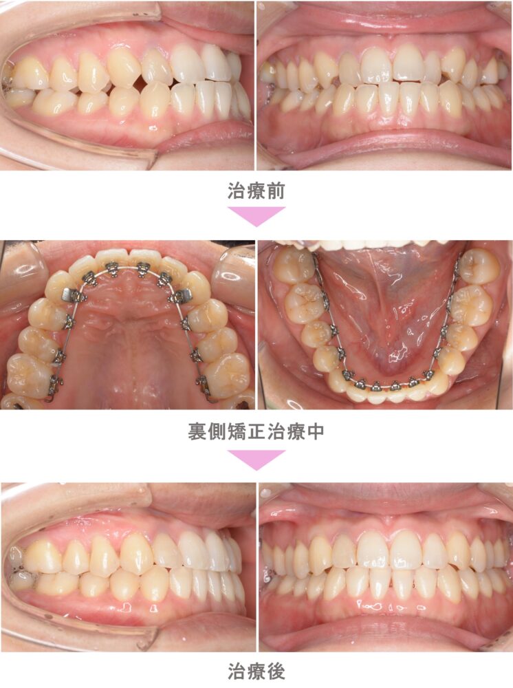 裏側矯正(舌側矯正)の症例のご紹介です。この患者様は、神奈川県相模原市からご来院の中学生女子で、受け口(反対咬合)と交叉咬合(すれ違い)と切端咬合(ぶつかる咬み合わせ)の症状がありました。治療法は裏側矯正(舌側矯正)。非抜歯で矯正治療を行い、キレイな歯並びになりました。治療期間は1年7か月です。