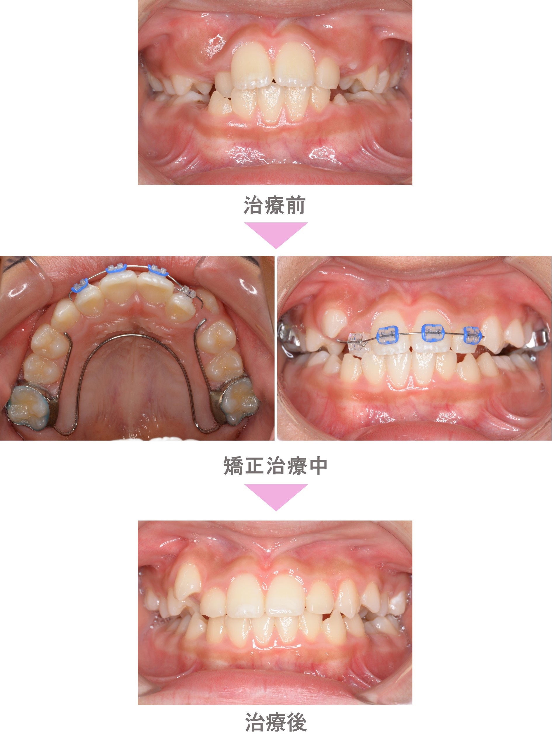 小児矯正(子供矯正)の症例のご紹介です。この患者様は、東京都世田谷区内からご来院の小学生男子で、叢生(前歯のでこぼこ)の症状がありました。治療法は小児矯正。固定式矯正装置を用い、萌出スペース確保し前歯を配列しました。側方歯交換まで経過観察が必要です。治療期間は1年3か月です。