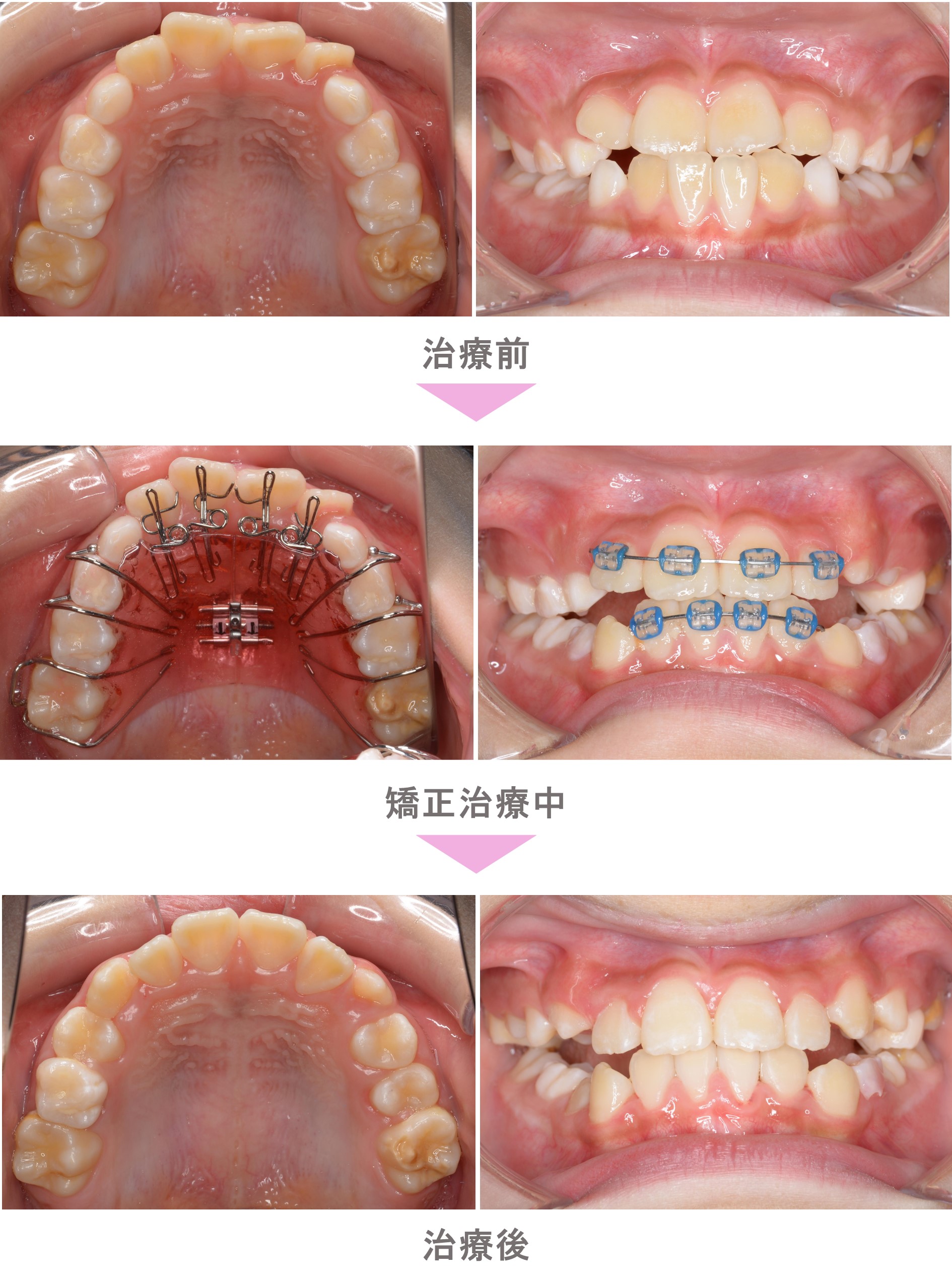小児矯正(子供矯正)の症例のご紹介です。この患者様は、神奈川県横浜市からご来院の小学生女子で、叢生(前歯のでこぼこ)の症状がありました。治療法は小児矯正。萌出スペース確保と前歯の配列を行いました。側方歯交換まで経過観察が必要です。治療期間は1年5か月です。