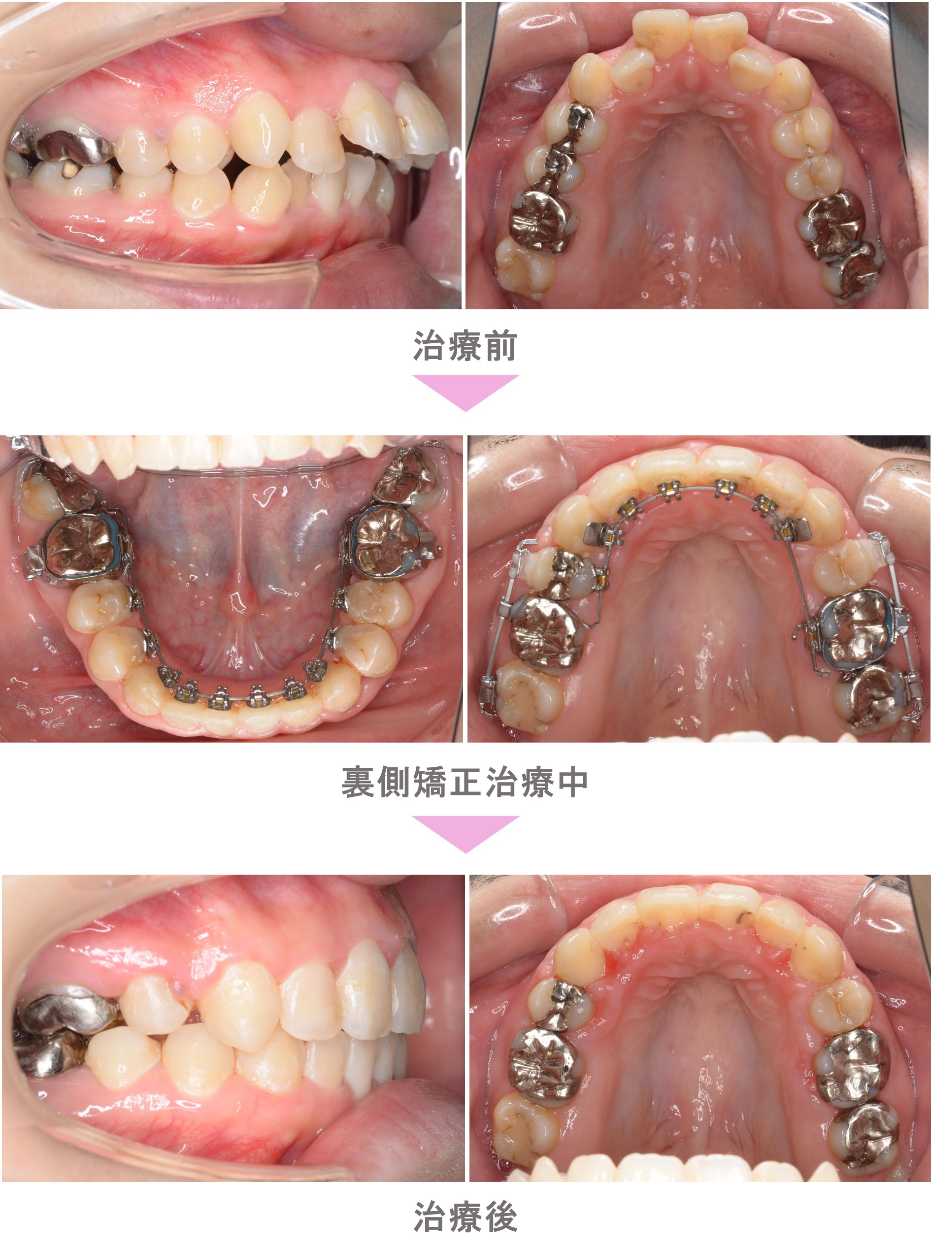 裏側矯正(舌側矯正)の症例紹介|叢生(前歯のでこぼこ)と上顎前突(出っ歯)の症状|抜歯による矯正治療|治療期間は1年8か月(神奈川県横浜市・20代女性 )