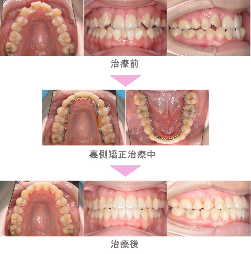 裏側矯正(舌側矯正)の症例紹介|出っ歯(上顎前突)と交叉咬合(すれ違い)の症状|抜歯による矯正治療|治療期間は2年4か月(東京都世田谷区・20代女性 )