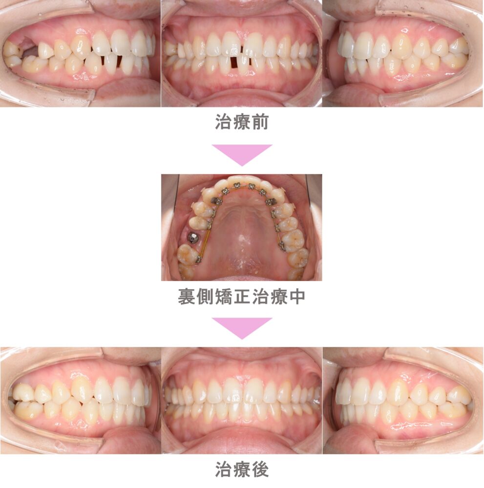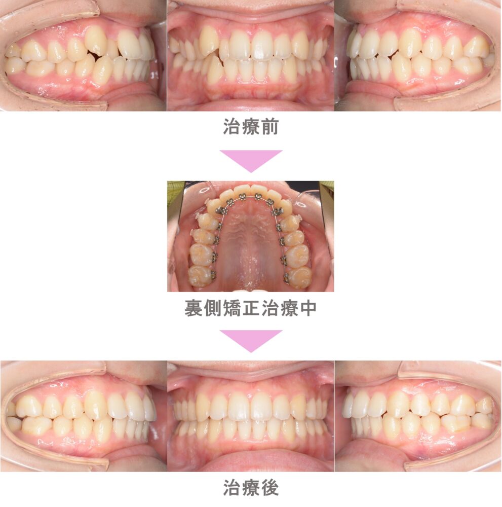 裏側矯正(舌側矯正)の症例紹介|前歯のでこぼこ(出っ歯) と叢生(でこぼこ)と八重歯(犬歯突出)の症状|抜歯による矯正治療|治療期間は2年(東京都世田谷区・中学生男子)