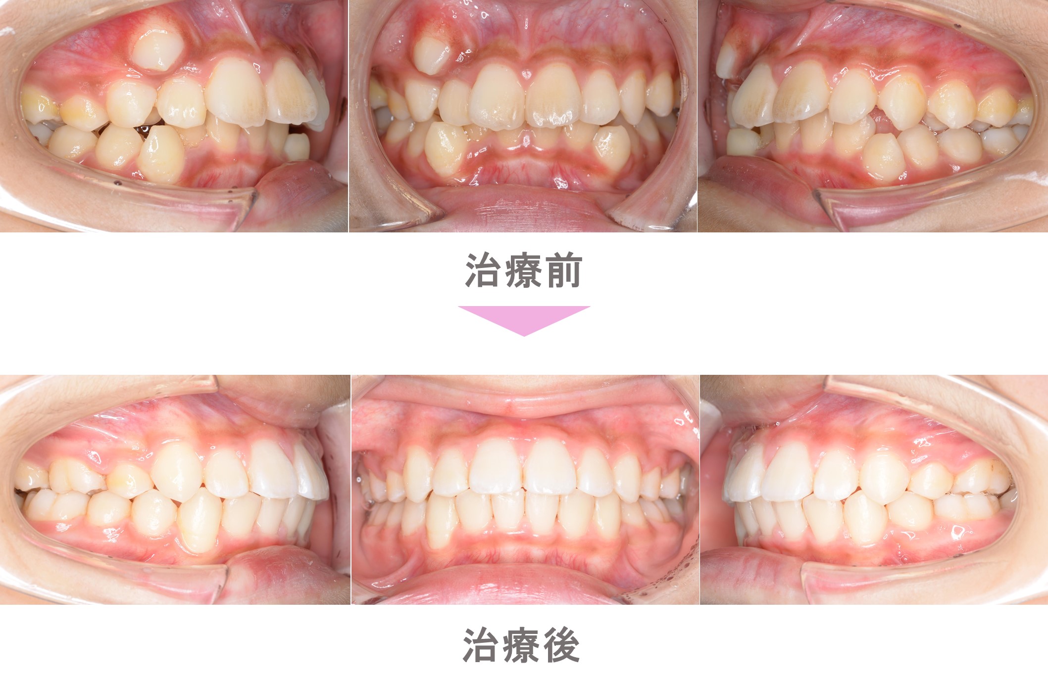 裏側矯正(舌側矯正)の症例のご紹介です。この患者様は、東京都世田谷区内からご来院の中学生男子で、前歯のでこぼこ(出っ歯) と叢生(でこぼこ)と八重歯(犬歯突出)の症状がありました。治療法は裏側矯正(舌側矯正)。4本抜歯で矯正治療を行い、キレイな歯並びになりました。治療期間は2年です。