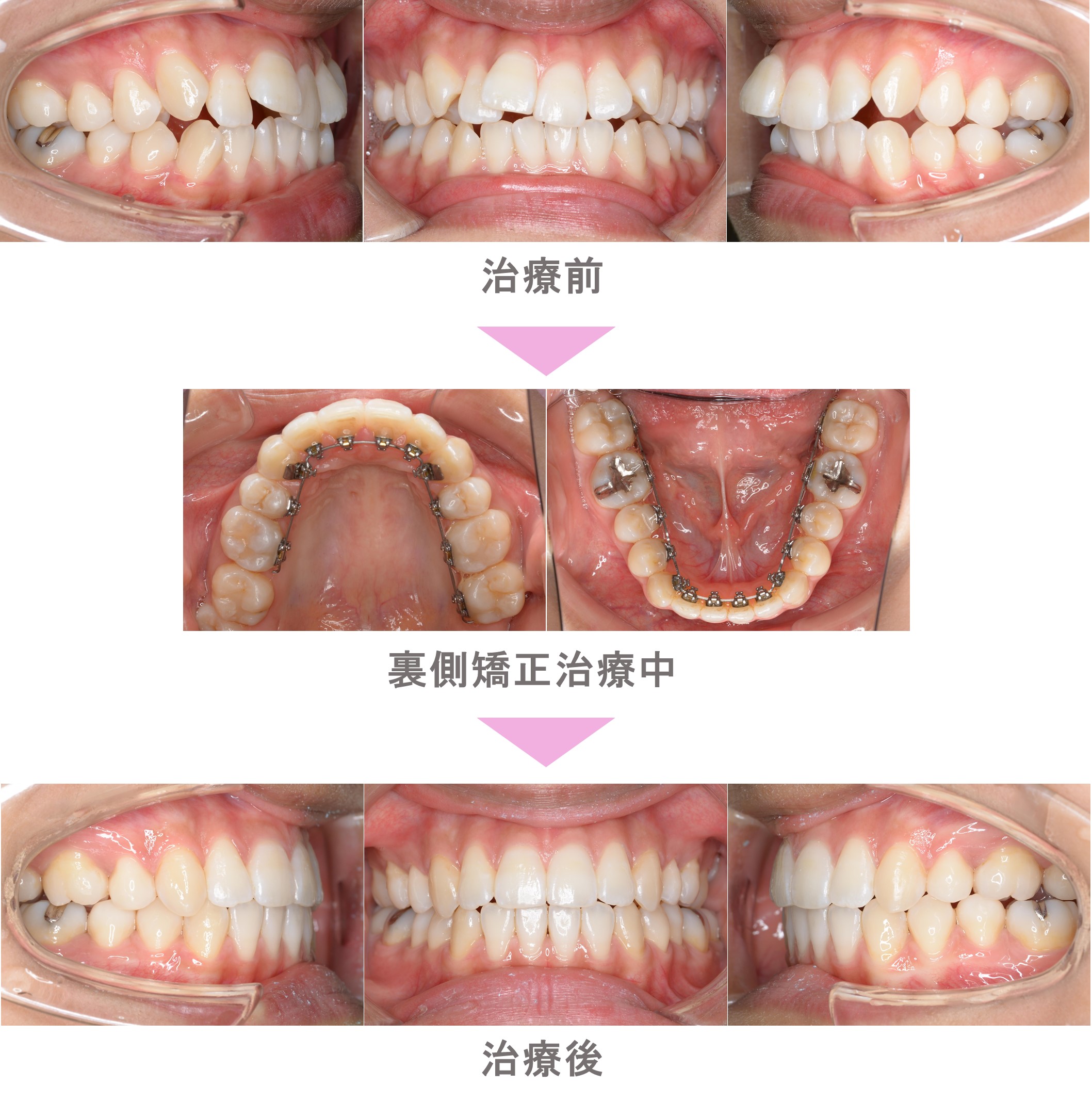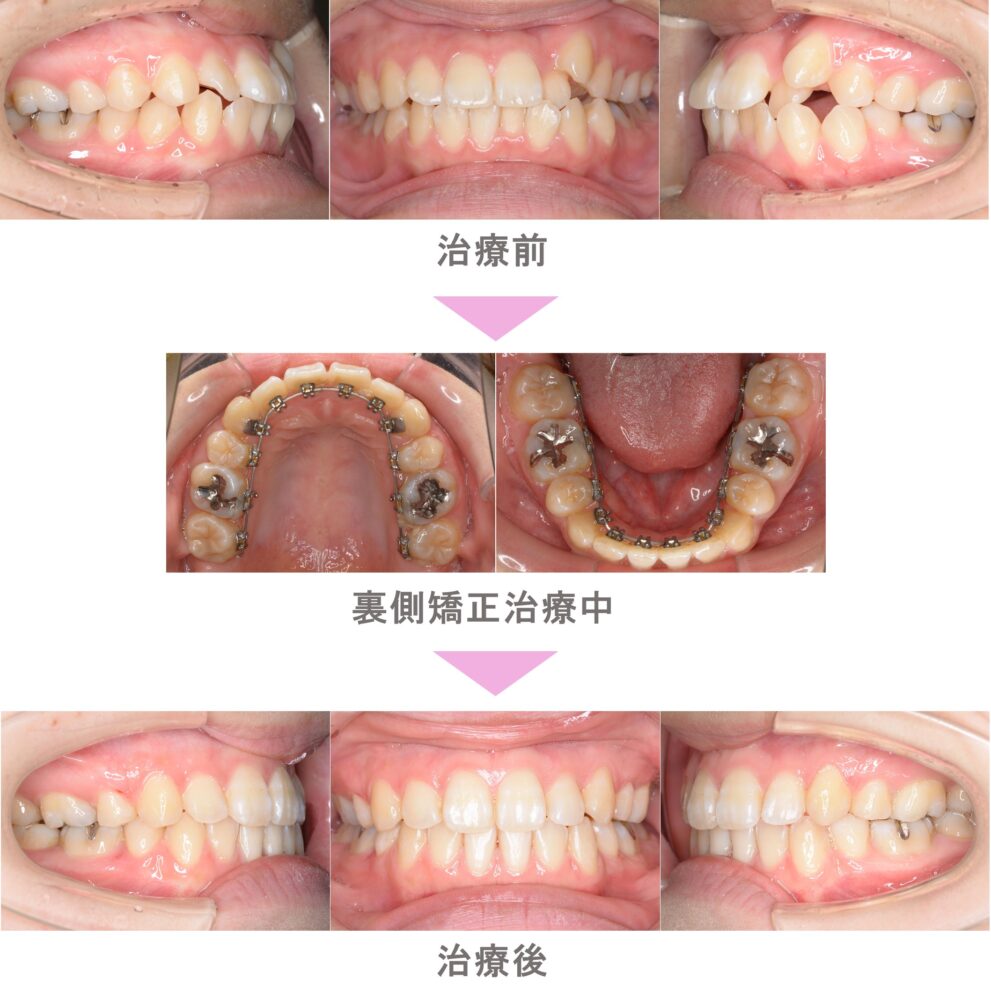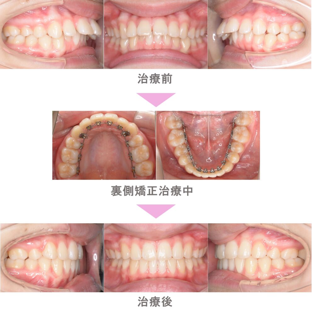 裏側矯正(舌側矯正)の症例紹介| 叢生(前歯のでこぼこ)の症状|抜歯による矯正治療|治療期間は2年5か月(東京都板橋区・20代女性 )