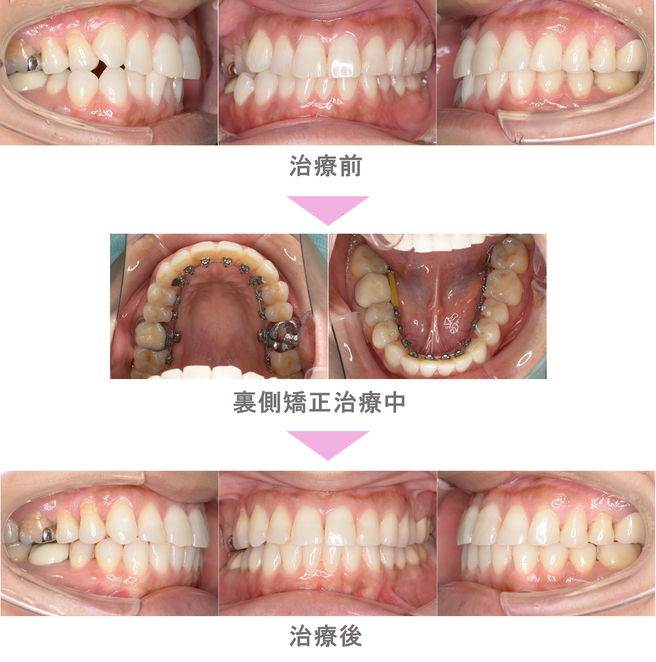 裏側矯正(舌側矯正)の症例のご紹介です。この患者様は、東京都板橋区内からご来院の20代女性で、叢生(前歯のでこぼこ)の症状がありました。治療法は裏側矯正(舌側矯正)。非抜歯にて右側の側方クロスバイトも綺麗に改善されました。治療期間は1年9か月です。