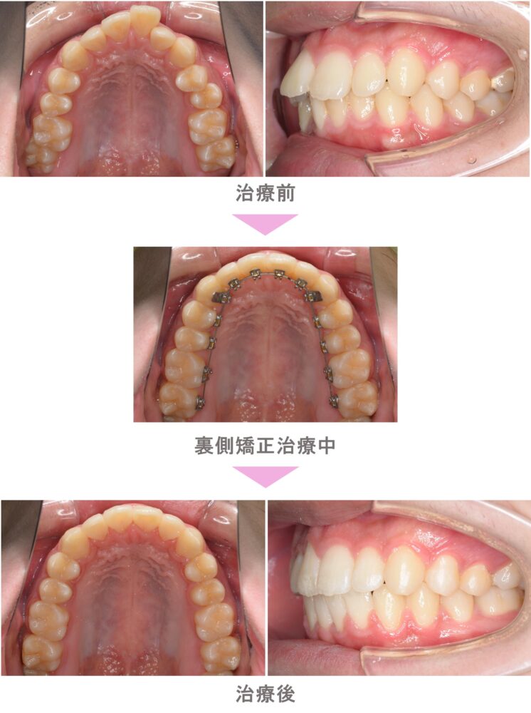 裏側矯正(舌側矯正)の症例紹介|叢生(前歯のでこぼこ)と八重歯(犬歯突出)と交叉咬合(すれ違い)の症状|抜歯による矯正治療|治療期間は2年2か月(神奈川県川崎市・高校生女子)