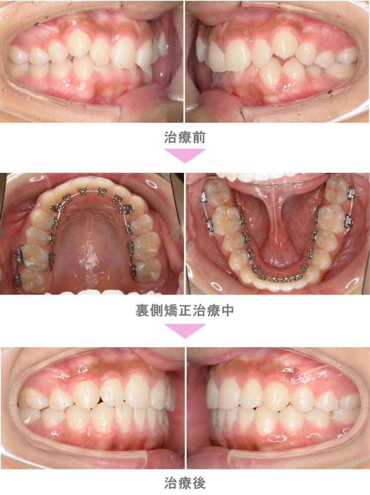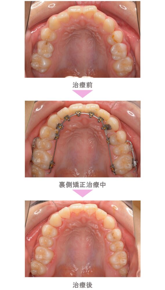 裏側矯正(舌側矯正)の症例紹介|叢生(前歯のでこぼこ)の症状|抜歯による矯正治療|治療期間は1年7か月(東京都世田谷区・30代女性 )