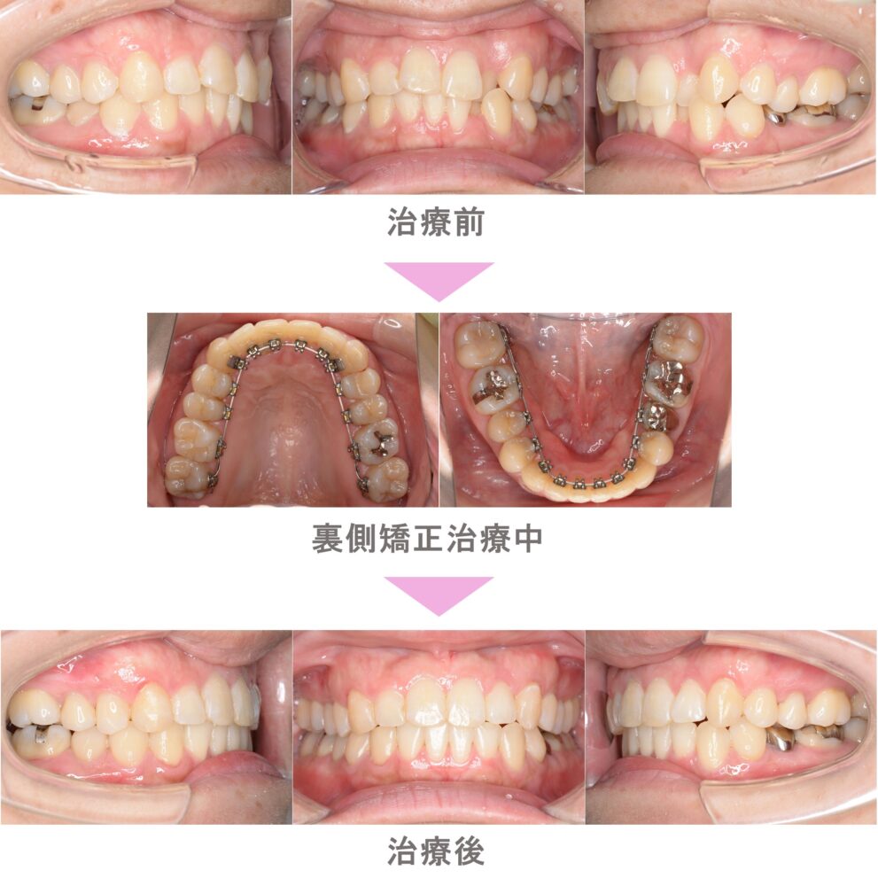 裏側矯正(舌側矯正)の症例紹介|叢生(前歯のでこぼこ)と交叉咬合(すれ違い)と切端咬合(ぶつかる咬み合わせ)の症状|抜歯による矯正治療|治療期間は2年(東京都世田谷区・30代女性 )