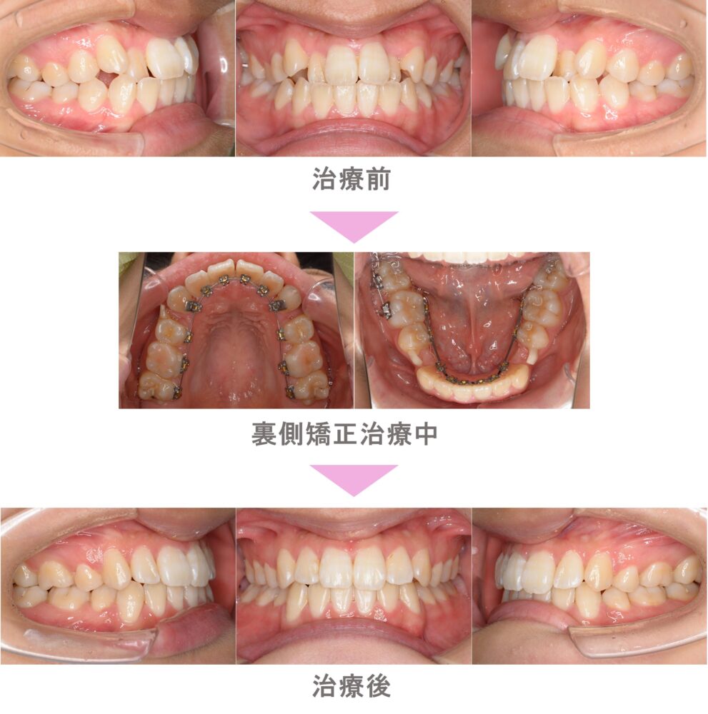 裏側矯正(舌側矯正)の症例のご紹介です。この患者様は、東京都世田谷区内からご来院の20代女性で、叢生(前歯のでこぼこ)と交叉咬合(すれ違い)と切端咬合(ぶつかる咬み合わせ)の症状がありました。治療法は裏側矯正(舌側矯正)。補綴部位の小臼歯を抜歯し矯正治療を行い、噛み合わせと見た目が改善されました。治療期間は2年です。