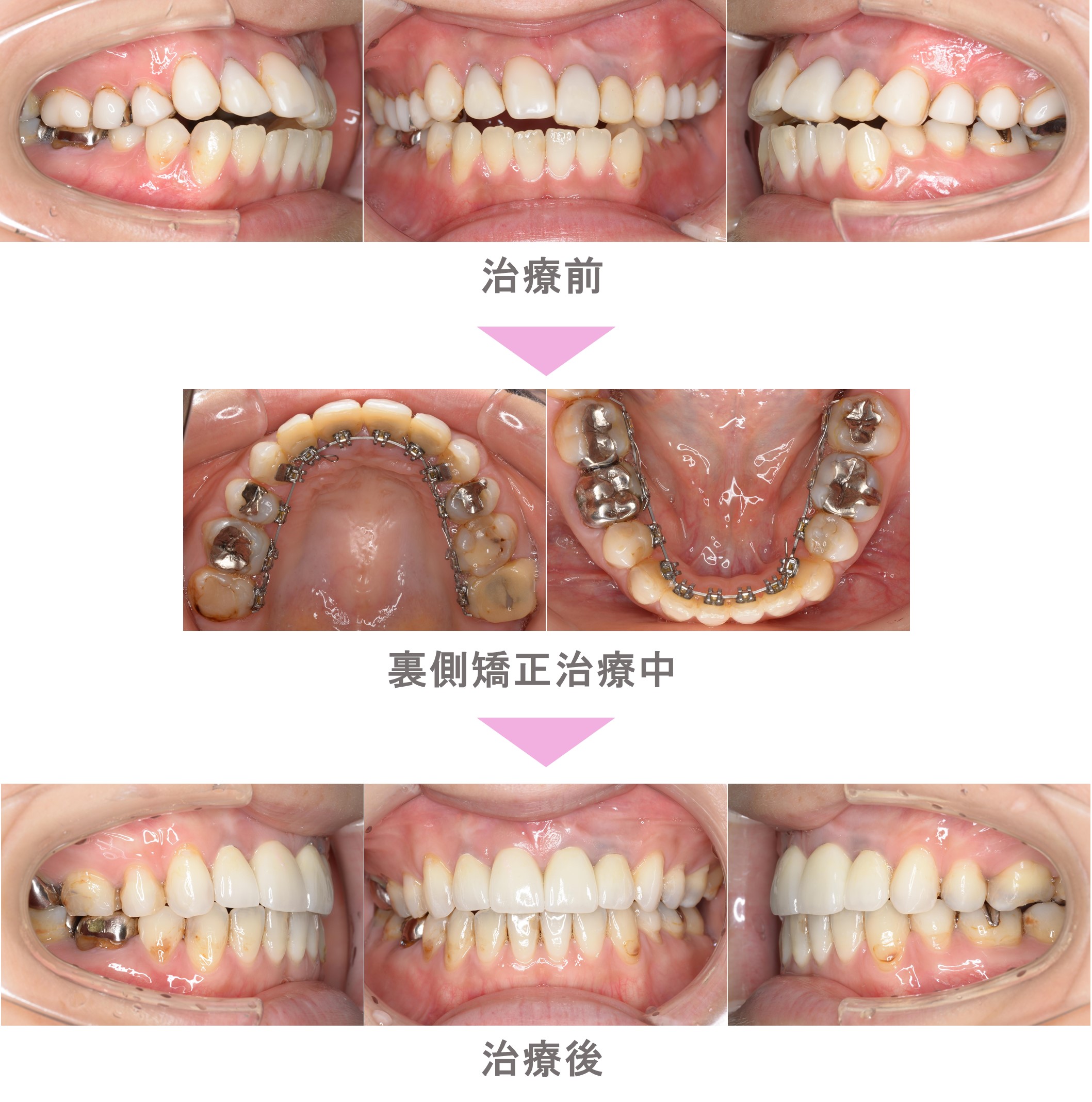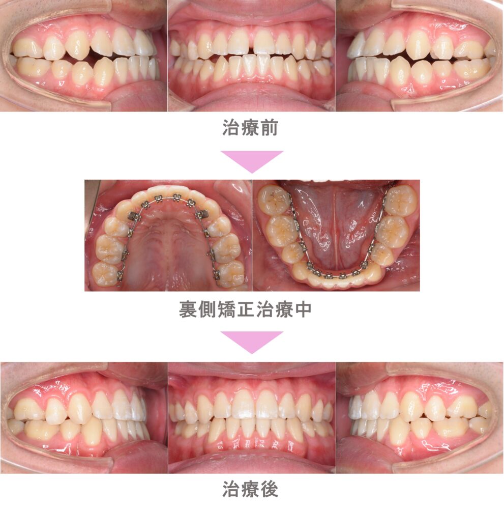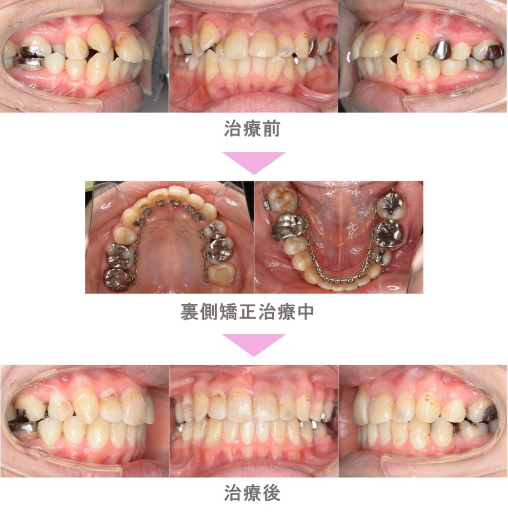 裏側矯正(舌側矯正)の症例紹介|開咬(オープンバイト)と上下顎前突(口ゴボ)の症状|抜歯による一般歯科連携(被せ物)矯正治療|治療期間は1年9か月(神奈川県川崎市・30代女性 )