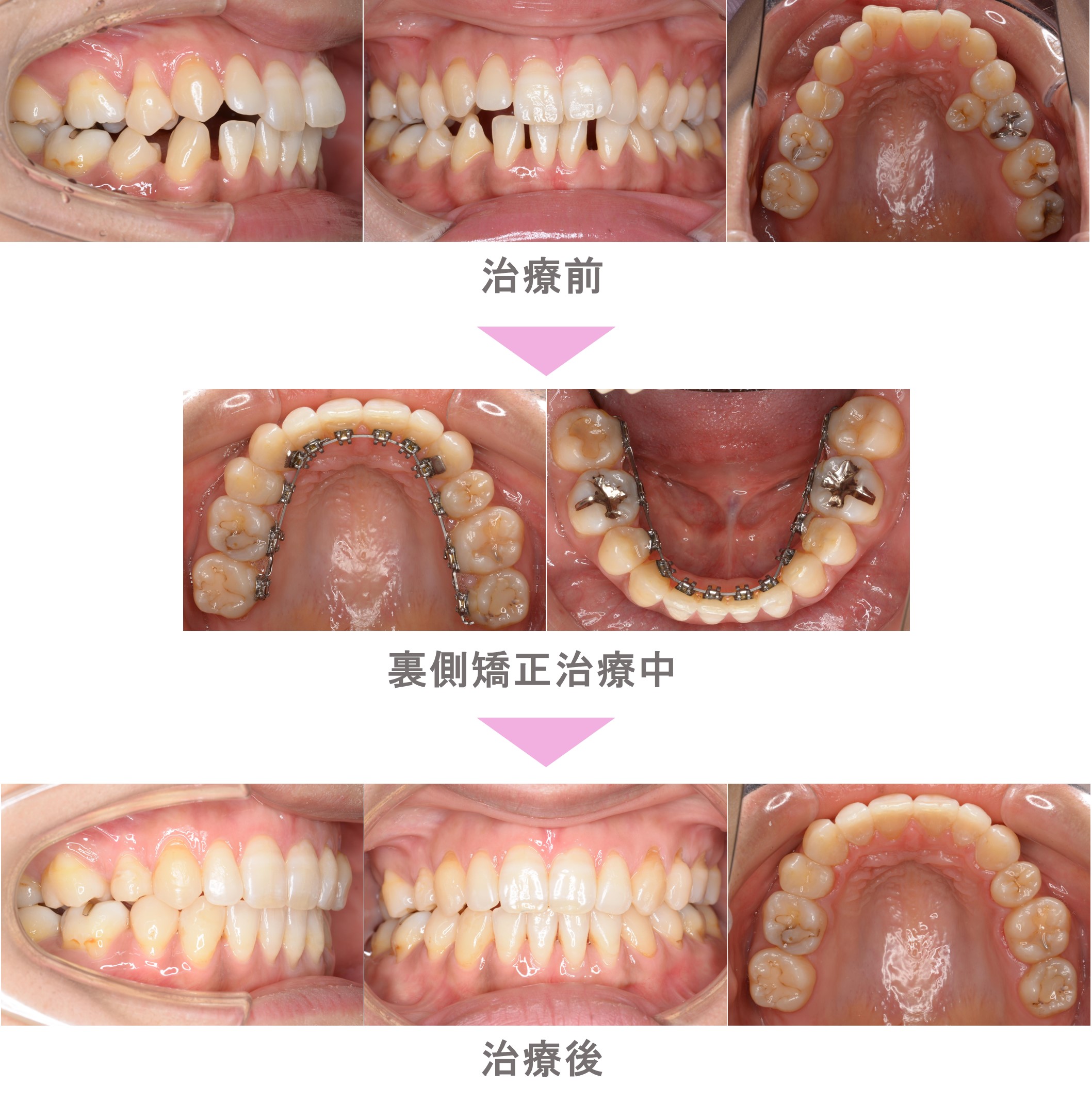 裏側矯正(舌側矯正)の症例のご紹介です。この患者様は、神奈川県川崎市からご来院の30代女性で、すきっ歯(空隙歯列)の症状がありました。治療法は裏側矯正(舌側矯正)。非抜歯で矯正治療を行い、キレイな歯並びになりました。