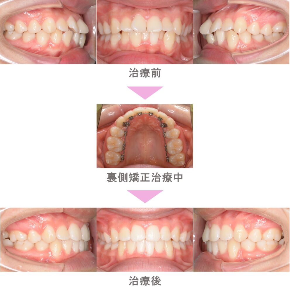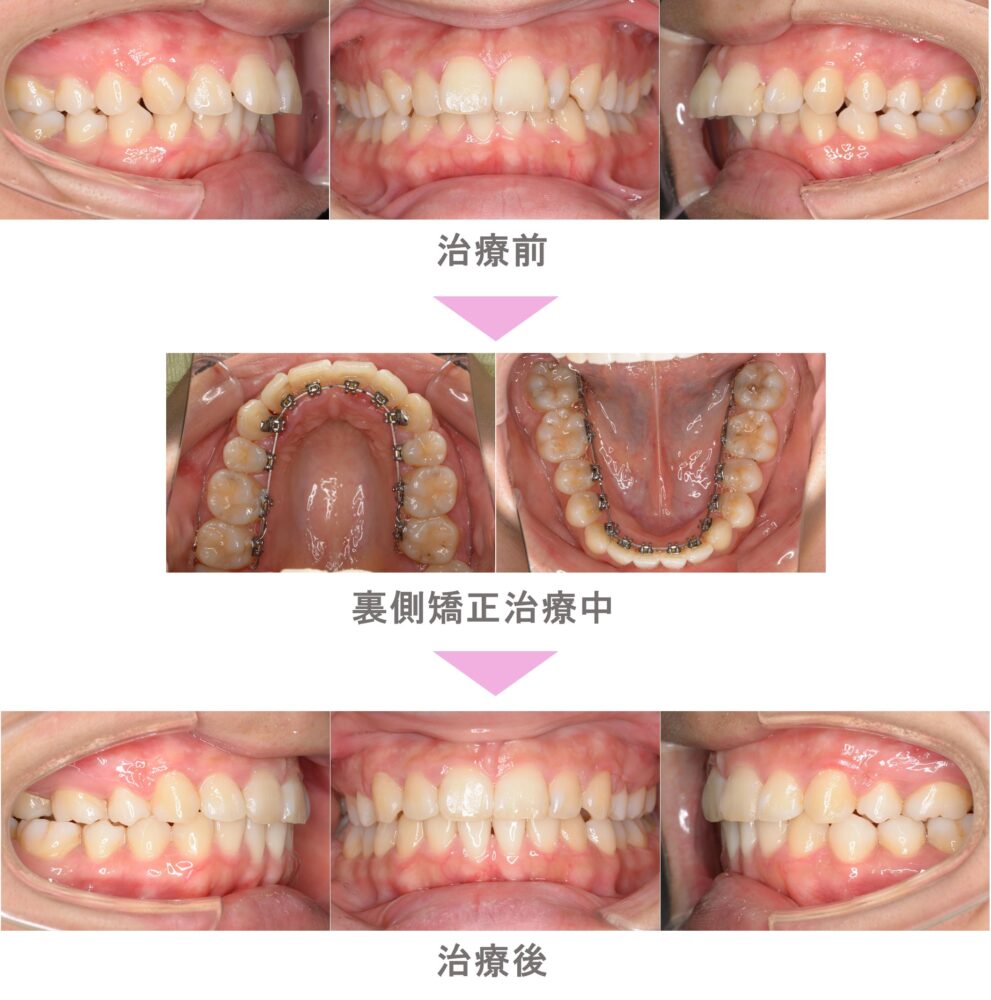 裏側矯正(舌側矯正)の症例のご紹介です。この患者様は、神奈川県川崎市からご来院の20代女性で、出っ歯(上顎前突)と上下顎前突(口ゴボ)の症状がありました。治療法は裏側矯正(舌側矯正)。非抜歯で矯正治療を行い、キレイな歯並びになりました。治療期間は1年11か月です。