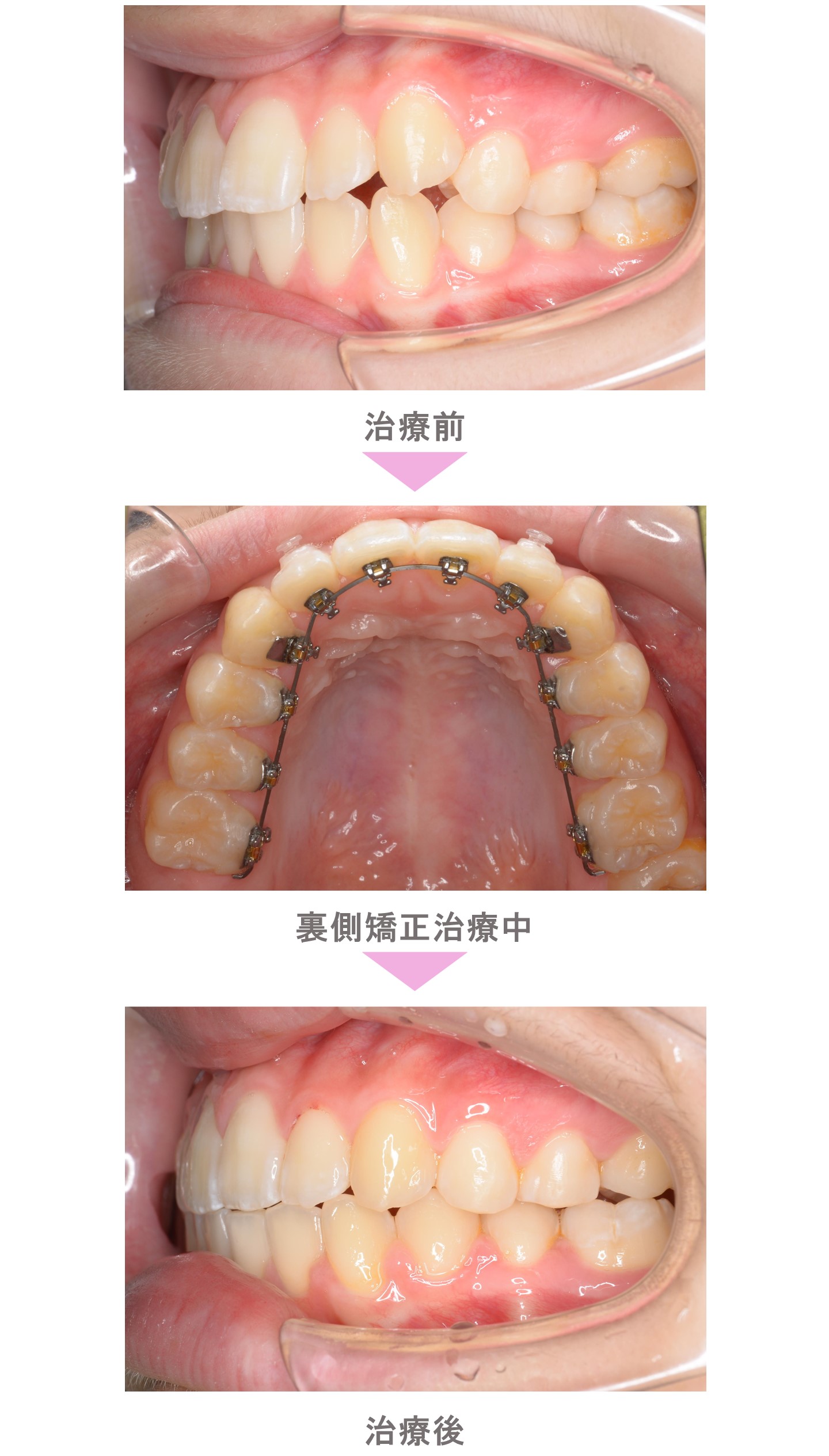 裏側矯正(舌側矯正)の症例紹介|叢生(前歯のでこぼこ)と八重歯(犬歯突出)の症状|非抜歯による矯正治療|治療期間は1年4ヵ月(東京都世田谷区・中学生女子 )