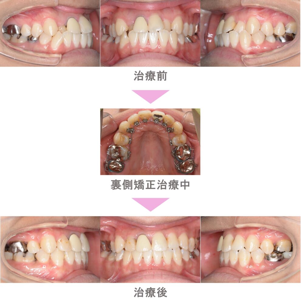 裏側矯正(舌側矯正)の症例紹介|叢生(前歯のでこぼこ)と交叉咬合(すれ違い)の症状|非抜歯による矯正治療|治療期間は1年11か月(東京都世田谷区・20代女性 )
