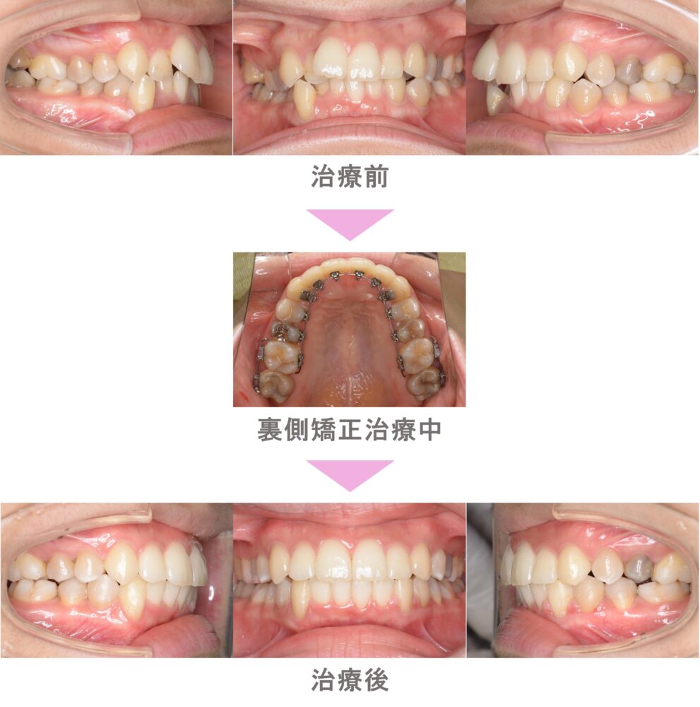 裏側矯正(舌側矯正)の症例紹介|叢生(前歯のでこぼこ)と交叉咬合(すれ違い) と切端咬合(ぶつかる咬み合わせ)の症状|抜歯による矯正治療|治療期間は2年3か月(神奈川県川崎市・30代女性 )