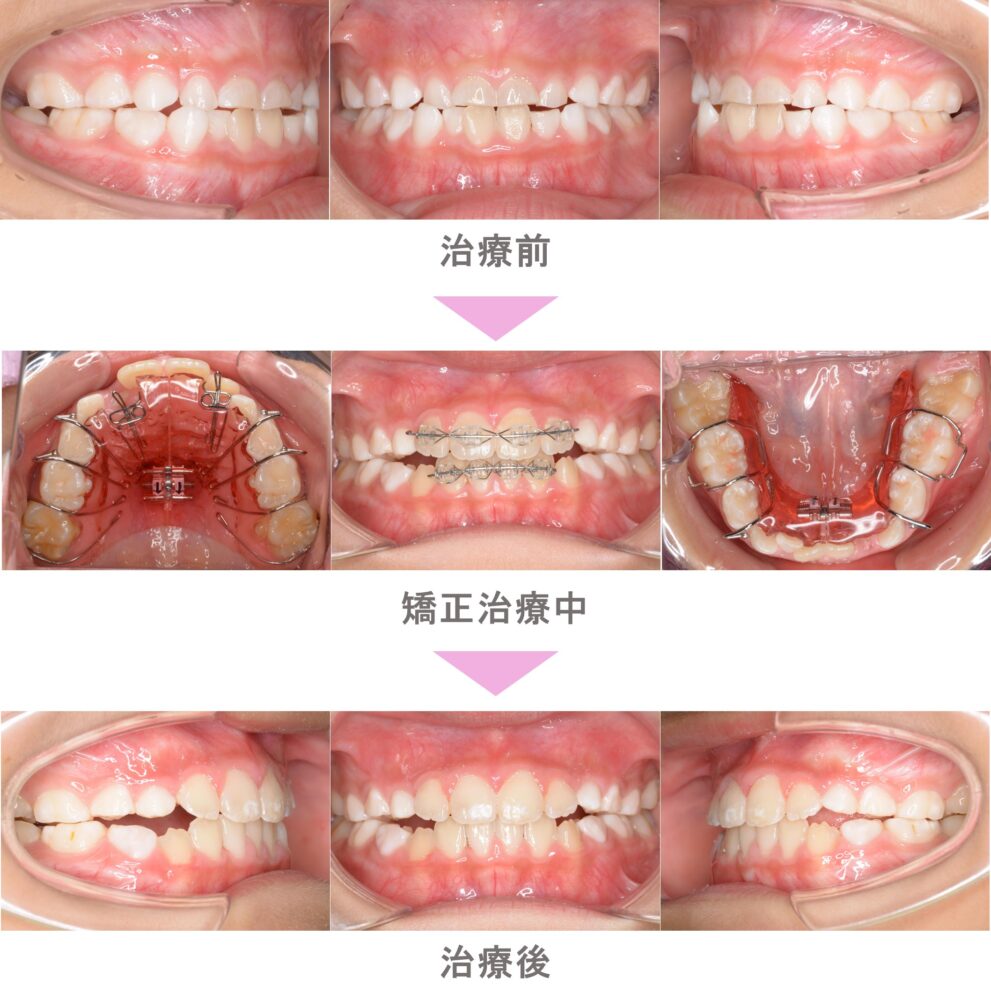 裏側矯正(舌側矯正)の症例のご紹介です。この患者様は、神奈川県川崎市からご来院の30代女性で、叢生(前歯のでこぼこ)と八重歯(犬歯突出)と過蓋咬合(深噛み)の症状がありました。治療法は裏側矯正(舌側矯正)。3本抜歯で矯正治療を行い、キレイな歯並びになりました。治療期間は2年5ヵ月です。
