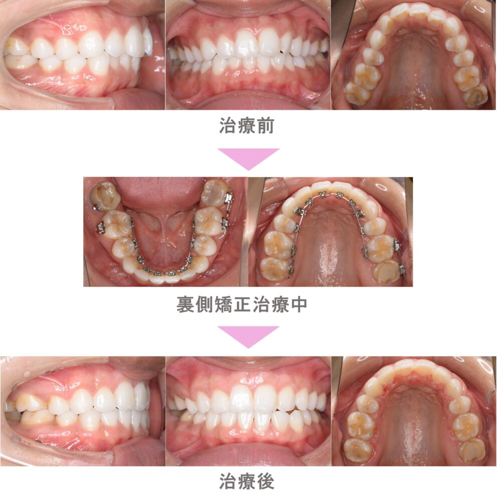裏側矯正(舌側矯正)の症例紹介|叢生(前歯のでこぼこ)と八重歯(犬歯突出)と過蓋咬合(深噛み)の症状|抜歯による矯正治療|治療期間は2年5ヵ月(神奈川県川崎市・30代女性 )