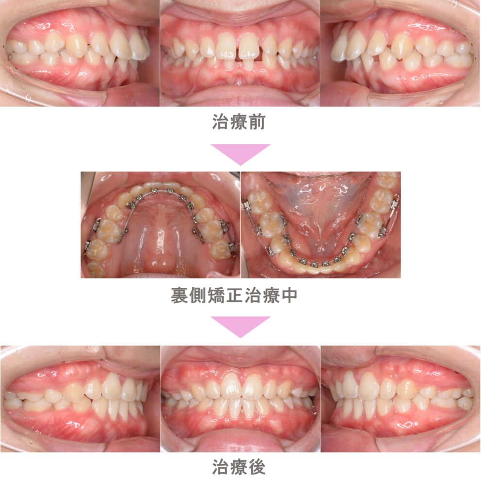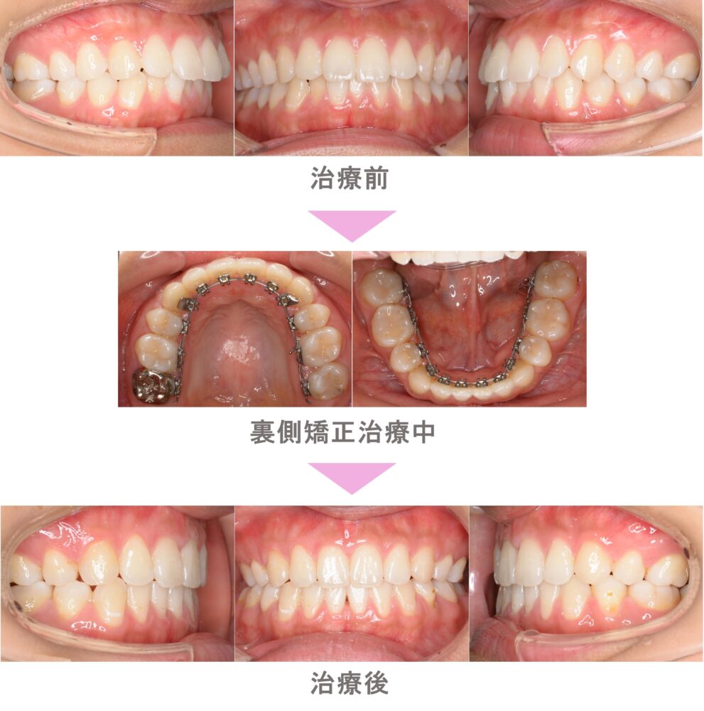 裏側矯正(舌側矯正)の症例紹介|叢生(前歯のでこぼこ)と出っ歯(上顎前突)の症状|抜歯による矯正治療|治療期間は1年9ヵ月(神奈川県横浜市・20代女性 )