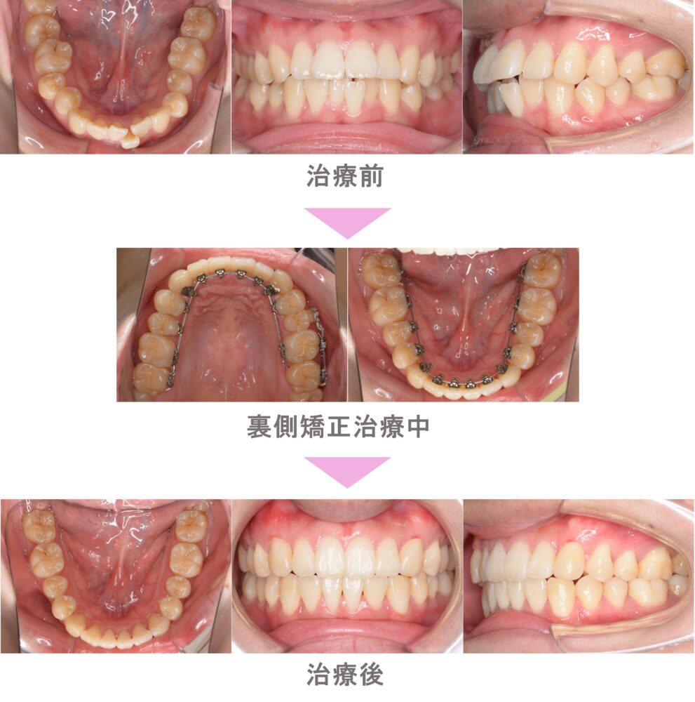 部分矯正(プチ矯正)・裏側矯正(舌側矯正)の症例紹介|叢生(前歯のでこぼこ)と交叉咬合(すれ違いとの症状|非抜歯による矯正治療|治療期間は11か月(東京都世田谷区・30代女性 )