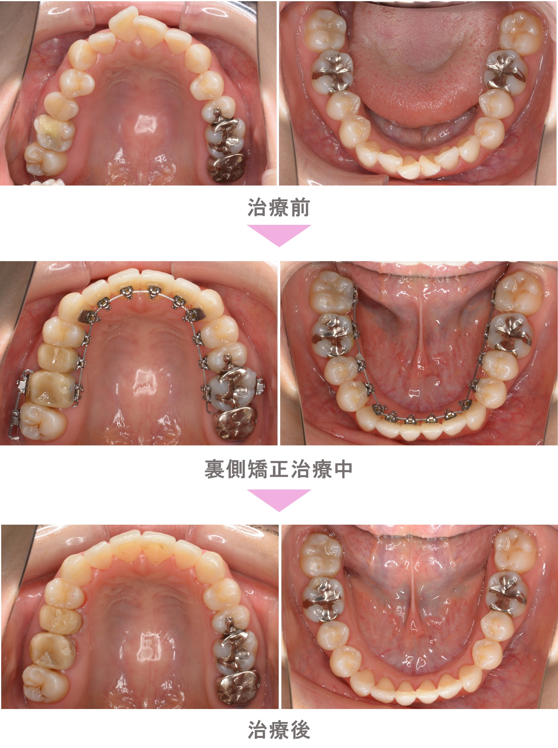 裏側矯正(舌側矯正)の症例紹介|叢生(前歯のでこぼこ)の症状|非抜歯による矯正治療|治療期間は1年10か月(東京都板橋区・20代女性 )