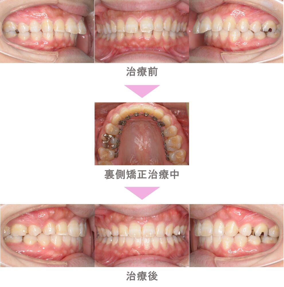 裏側矯正(舌側矯正)の症例紹介|叢生(前歯のでこぼこ)と上下顎前突(口ゴボ)の症状|非抜歯による矯正治療|治療期間は1年(神奈川県川崎市・30代女性 )