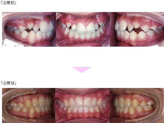 裏側矯正(舌側矯正)の症例のご紹介です。この患者様は、東京都世田谷区からご来院で、叢生(前歯のでこぼこ)と八重歯(犬歯突出)と交叉咬合(すれ違い)の症状がありました。治療法は裏側矯正(舌側矯正)。4本抜歯で矯正治療を行い、キレイな歯並びになりました。治療期間は2年です。