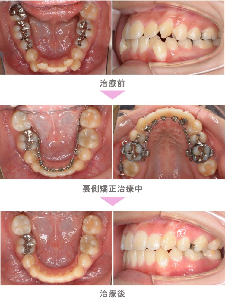 裏側矯正(舌側矯正)の症例のご紹介です。この患者様は、東京都世田谷区からご来院の中学生女子で、叢生(前歯のでこぼこ)と八重歯(犬歯突出)の症状がありました。治療法は裏側矯正(舌側矯正)。3本抜歯で矯正治療を行い、キレイな歯並びになりました。