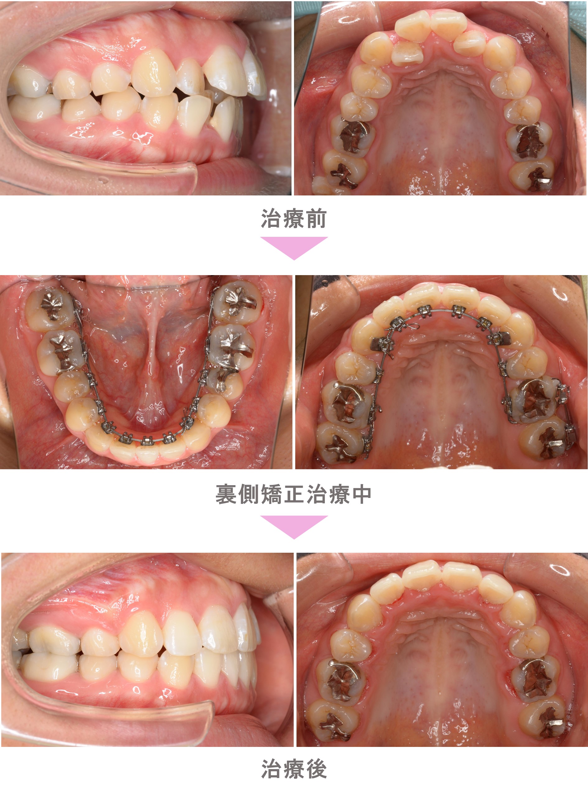 裏側矯正(舌側矯正)の症例紹介|叢生(前歯のでこぼこ)と出っ歯(上顎前突)の症状|抜歯による矯正治療|治療期間は2年3か月(神奈川県川崎市・20代女性 )