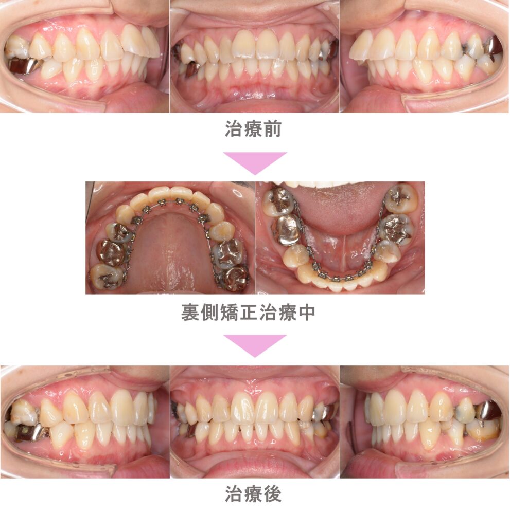 裏側矯正(舌側矯正)の症例のご紹介です。この患者様は、神奈川県川崎市内からご来院の20代女性で、叢生(前歯のでこぼこ)の症状がありました。治療法は裏側矯正(舌側矯正)。非抜歯で側方拡大を伴う矯正治療を行い、キレイな歯並びになりました。治療期間は1年6か月です。