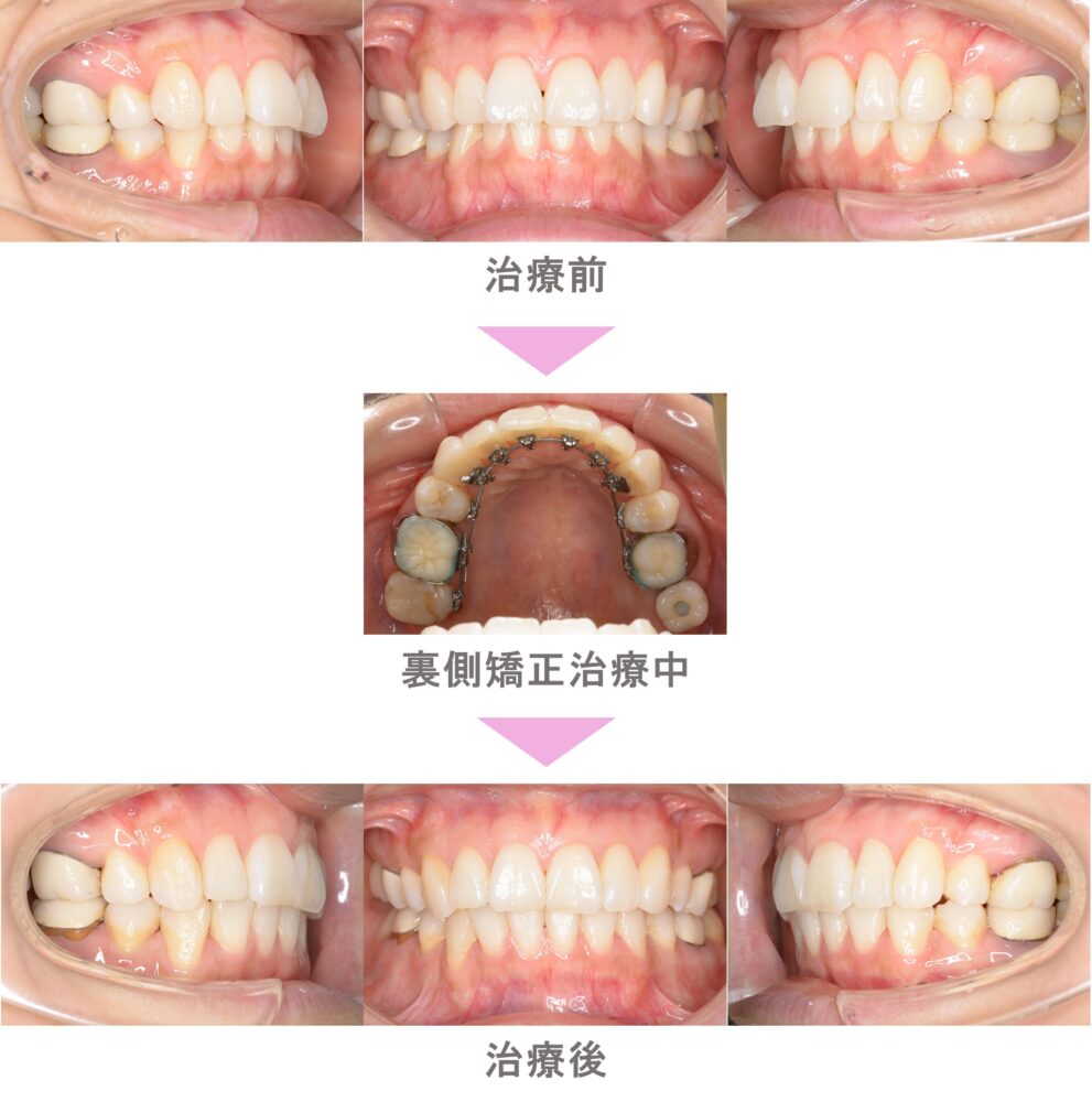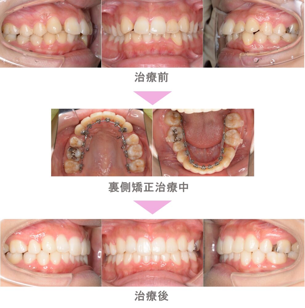 裏側矯正(舌側矯正)の症例紹介|叢生(前歯のでこぼこ)の症状|抜歯による矯正治療|治療期間は1年6か月(東京都世田谷区・20代女性 )