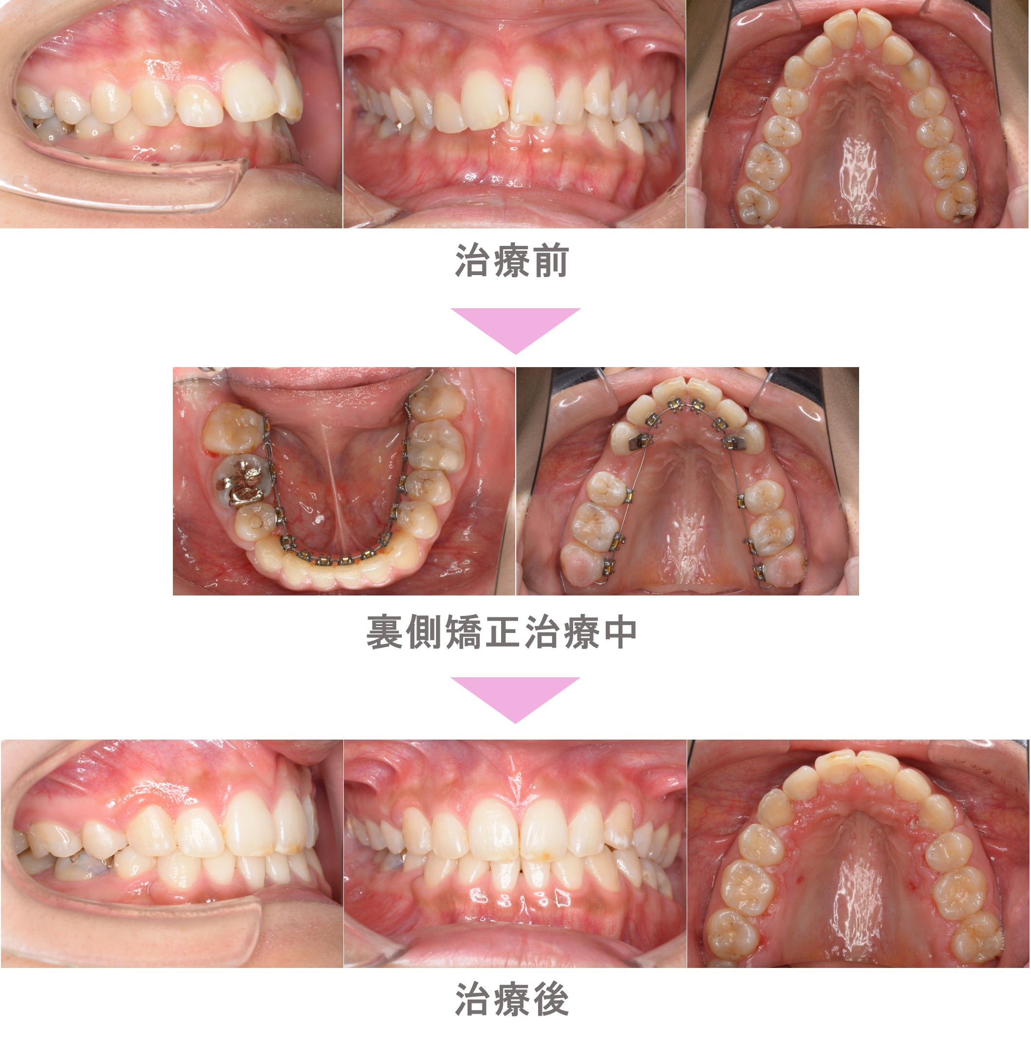 裏側矯正(舌側矯正)の症例紹介|出っ歯(上顎前突)と過蓋咬合(深噛み)の症状|非抜歯にる矯正治療|治療期間は2年4か月(神奈川県横浜市・20代女性 )