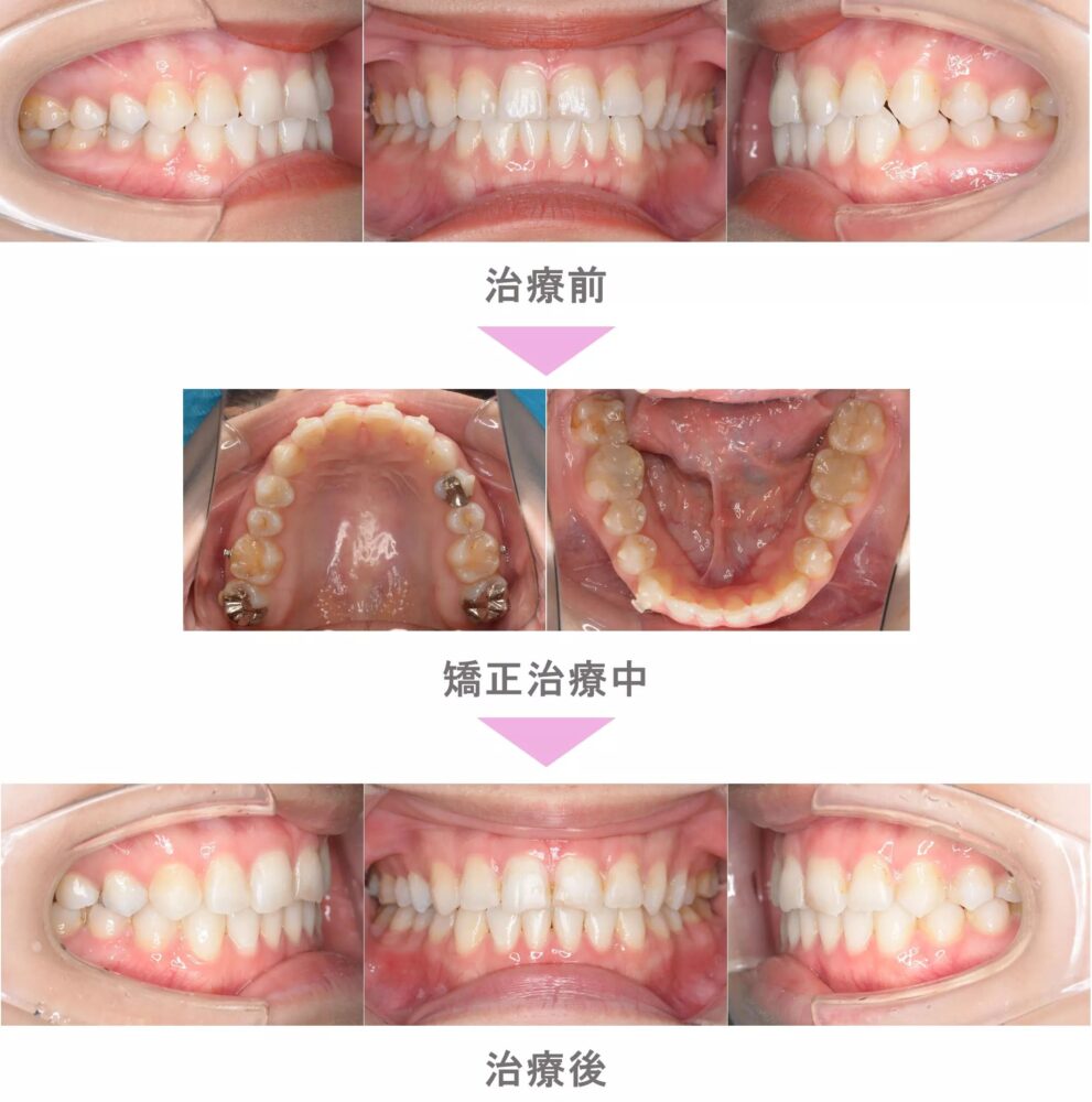 裏側矯正(舌側矯正)の症例紹介|開咬(前歯が噛んでいない)と出っ歯(上顎前突)の症状|抜歯による矯正治療|治療期間は1年7か月(神奈川県川崎市・30代女性 )