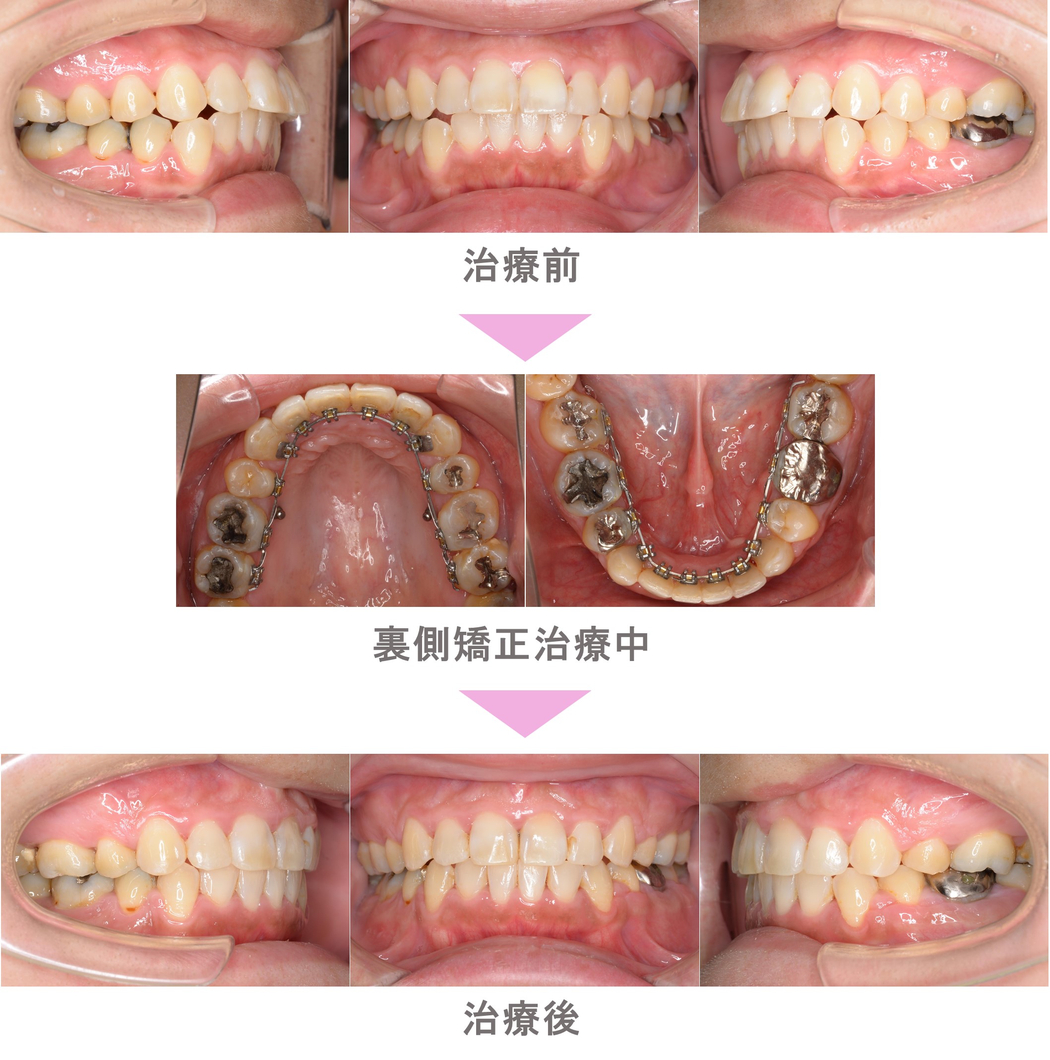 裏側矯正(舌側矯正)の症例紹介|出っ歯(上顎前突)の症状|抜歯による矯正治療|治療期間は2年1ヶ月(神奈川県川崎市・40代女性 )