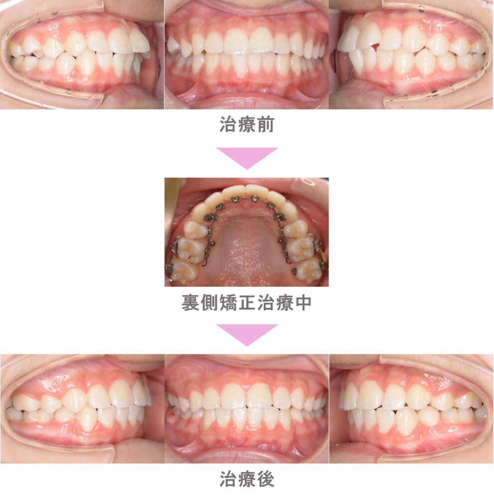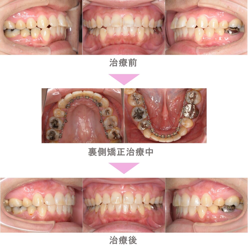 裏側矯正(舌側矯正)の症例紹介|出っ歯(上顎前突)と叢生(前歯のでこぼこ)の症状|抜歯による矯正治療|治療期間は2年6ヶ月(神奈川県横浜市・20代女性 )