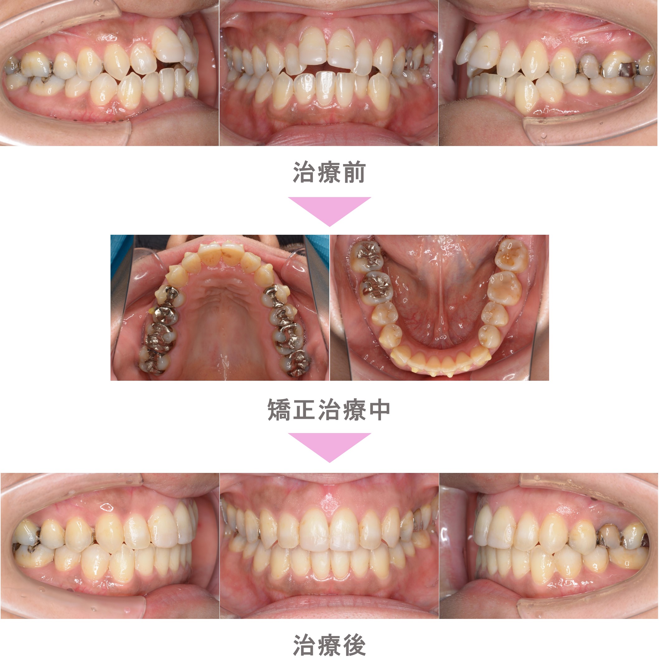 インビザライン矯正(マウスピース矯正)の症例紹介|叢生(前歯のでこぼこ)と出っ歯(上顎前突)と開咬(オープンバイト)の症状|非抜歯による矯正治療|治療期間は1年8ヵ月(東京都世田谷区・30代女性 )