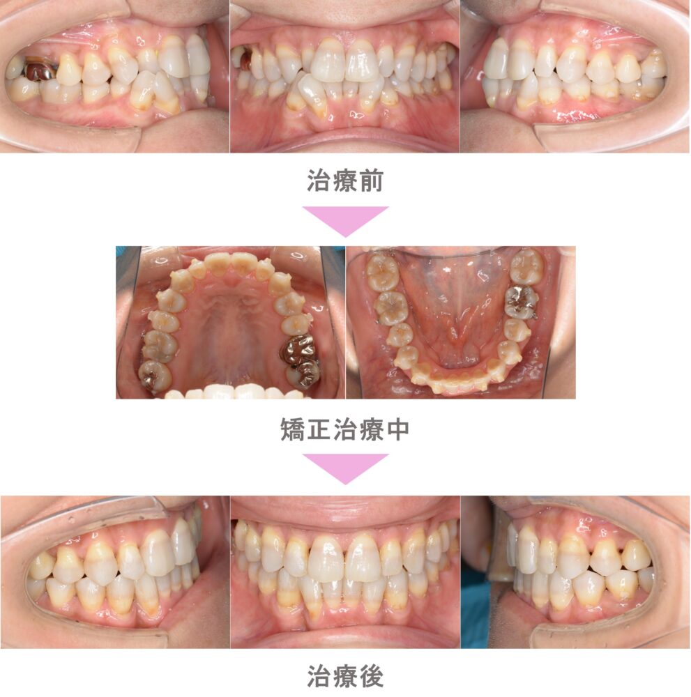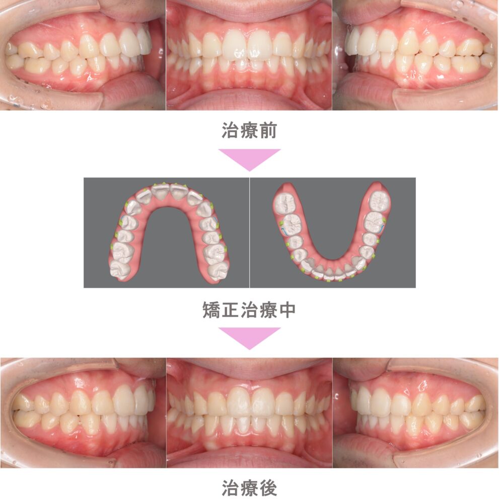 インビザライン矯正(マウスピース矯正)の症例紹介|叢生(前歯のでこぼこ)と受け口(反対咬合)の症状|非抜歯による矯正治療|治療期間は1年3か月(東京都府中市・20代女性 )
