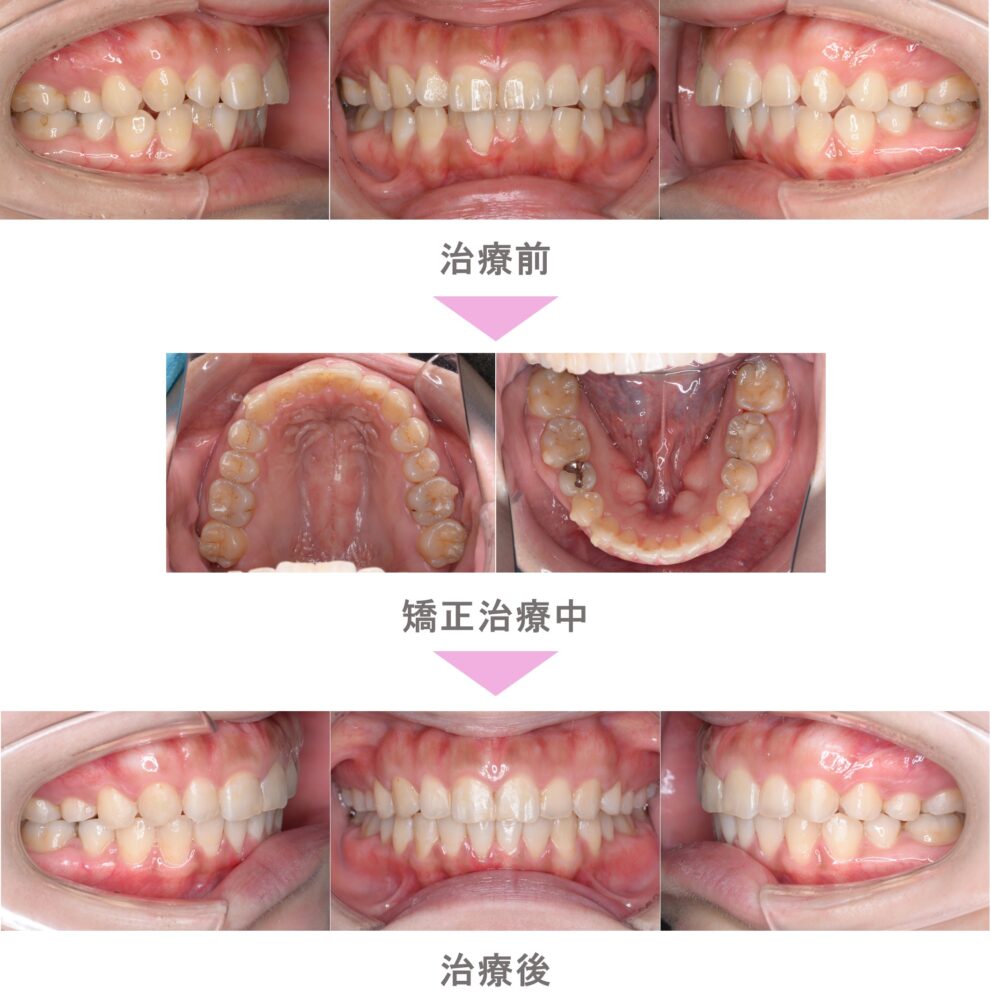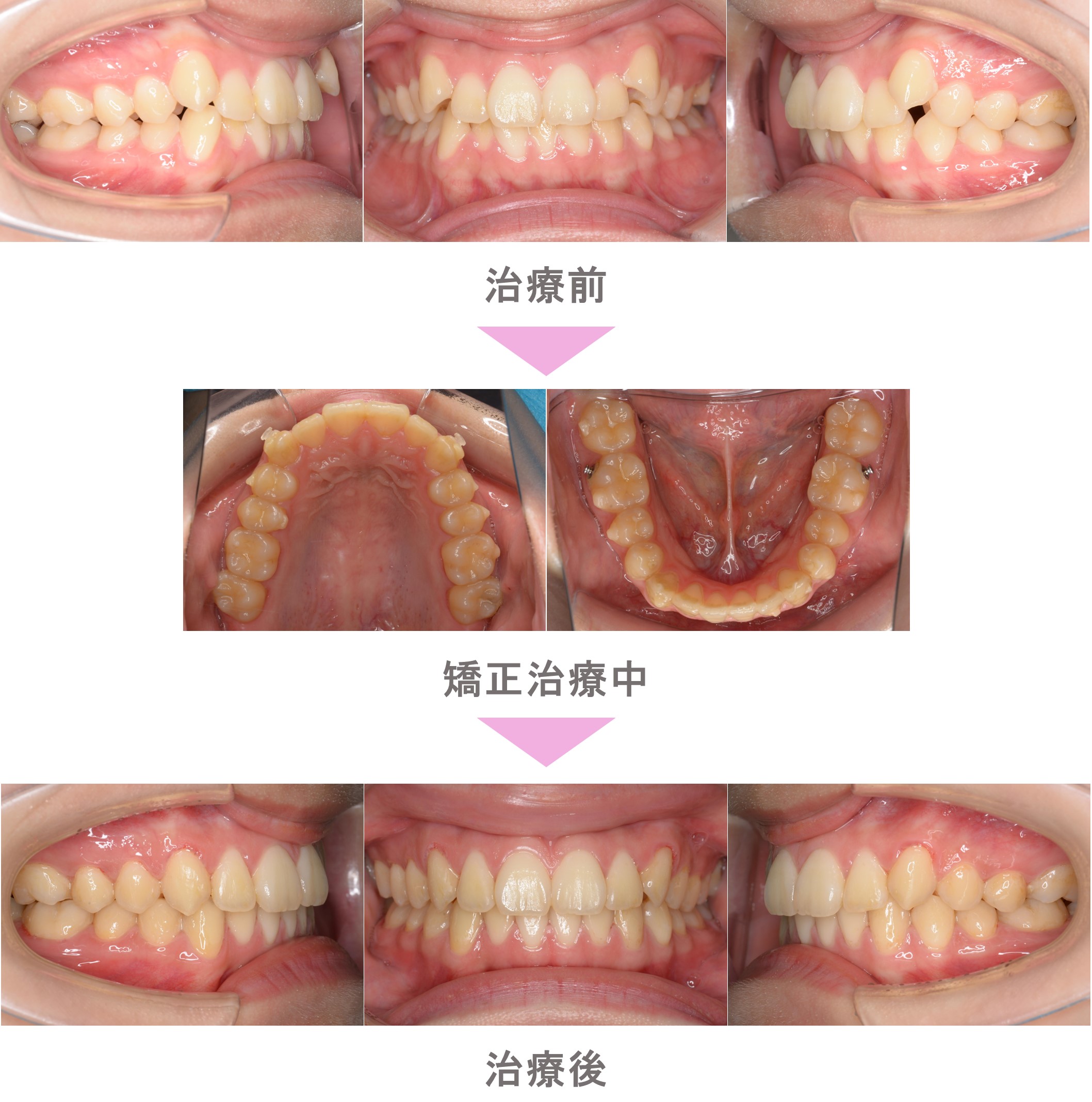 インビザライン矯正(マウスピース矯正)の症例のご紹介です。この患者様は、神奈川県川崎市からご来院の20代女性で、叢生(前歯のでこぼこ)と八重歯(犬歯突出)の症状の症状がありました。治療法はインビザライン矯正。非抜歯で矯正治療を行い、キレイな歯並びになりました。治療期間は2年3か月です。