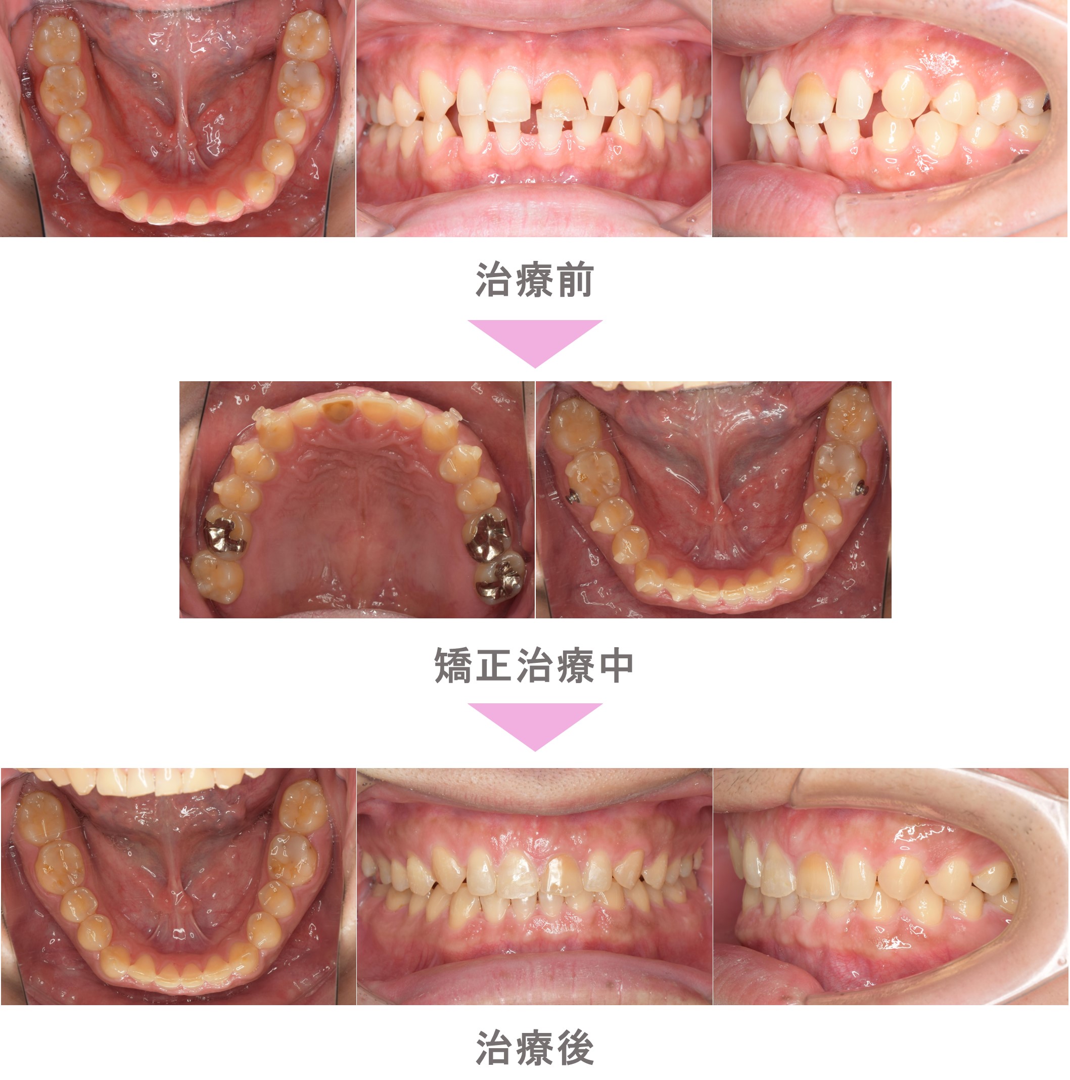 インビザライン矯正(マウスピース矯正)の症例のご紹介です。この患者様は、東京都多摩市からご来院の30代男性で、すきっ歯(空隙歯列)と上下顎前突(口ゴボ)の症状の症状がありました。治療法はインビザライン矯正。非抜歯で矯正治療を行い、キレイな歯並びになりました。治療期間は9か月です。