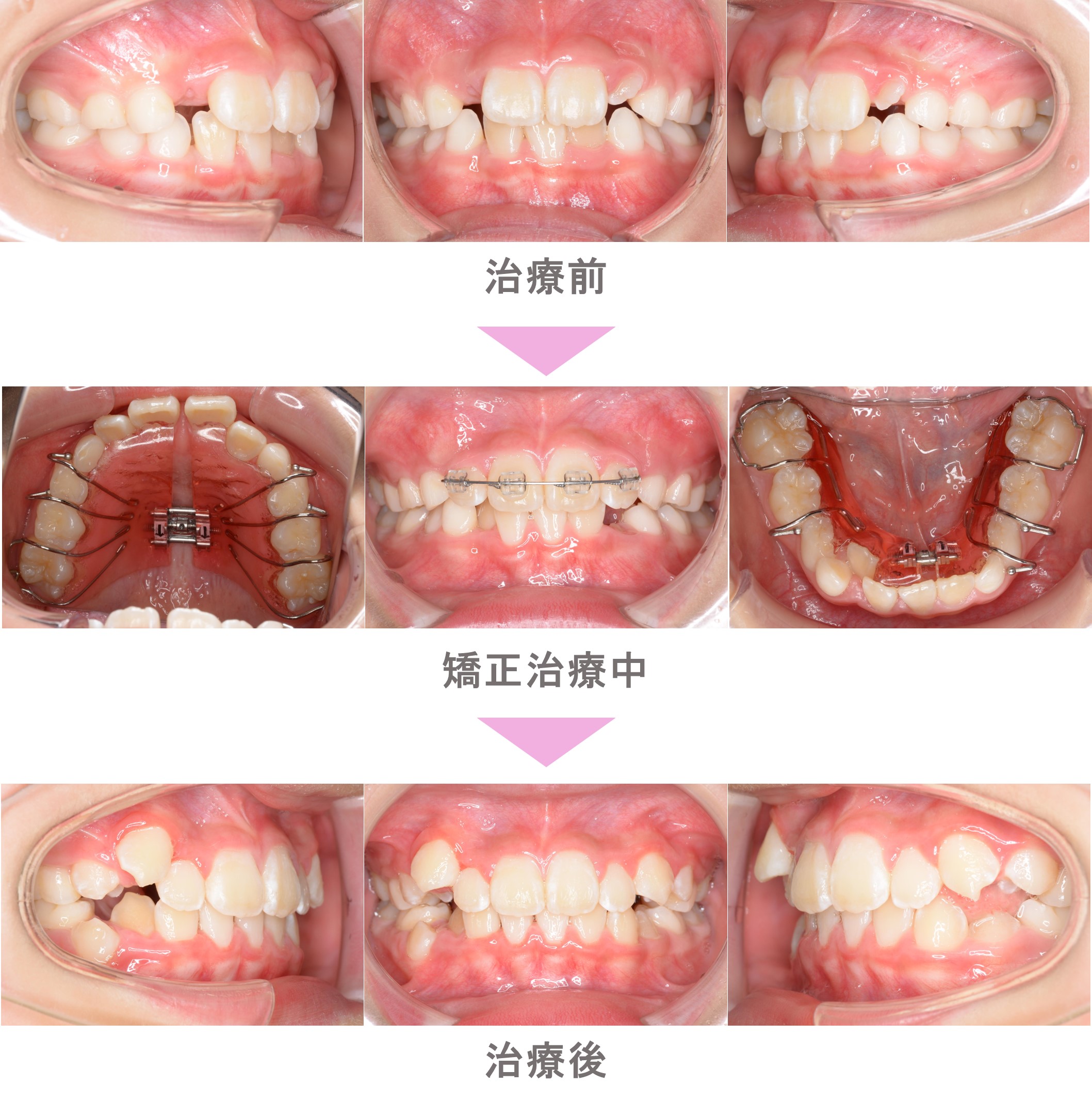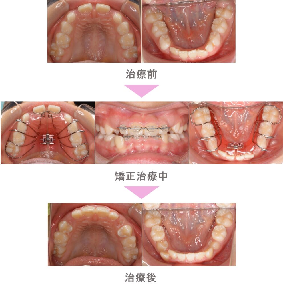 小児矯正(子供矯正)の症例のご紹介です。この患者様は、世田谷区内からご来院の小学生女子で、叢生(前歯のでこぼこ)の症状がありました。治療法は小児矯正。上下拡大床の使用後、前歯部の配列を行いました。リスクとして、あともどりがあるのでしっかりリテーナーを入れる必要があります。治療期間は2年10か月です。