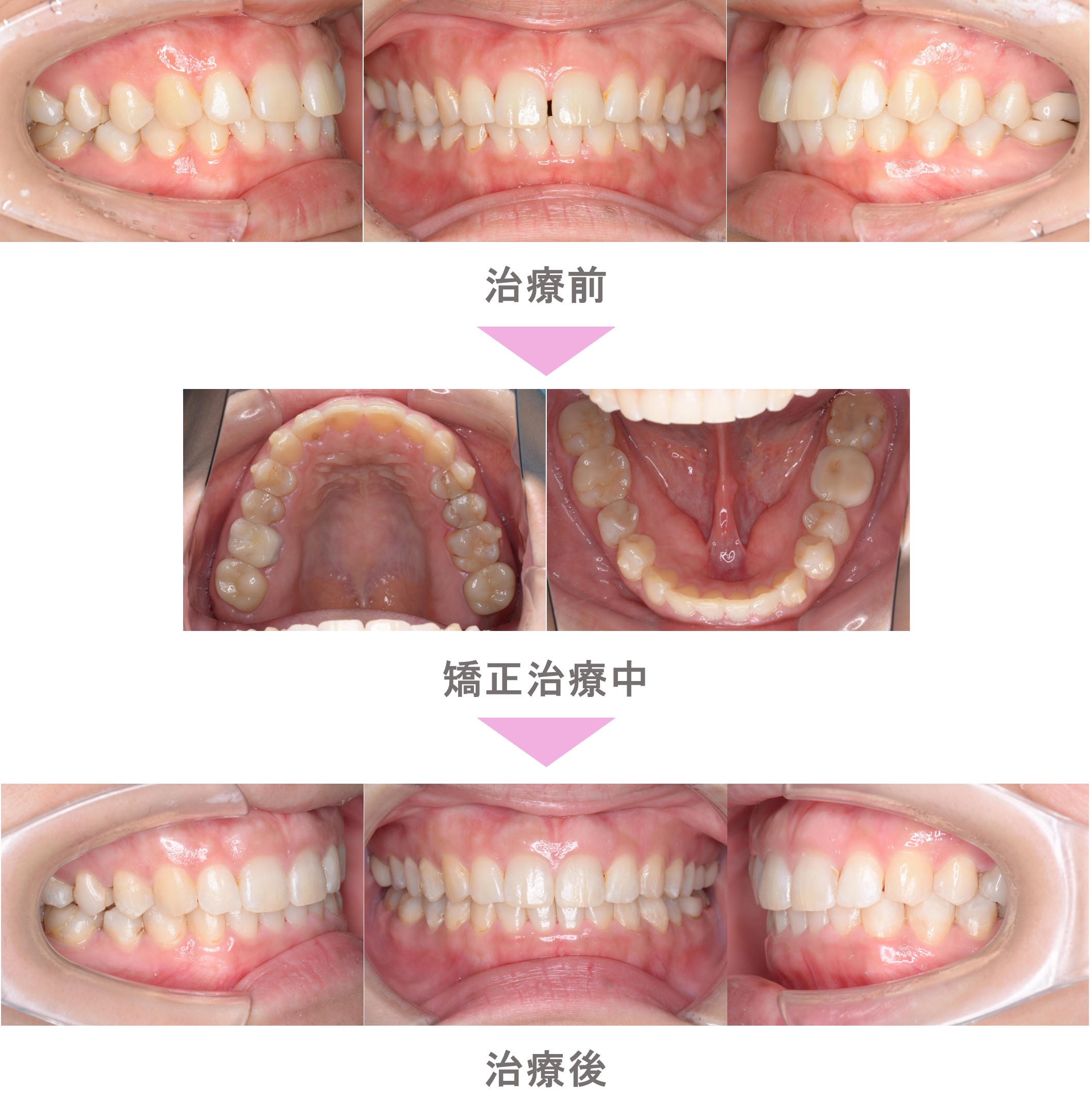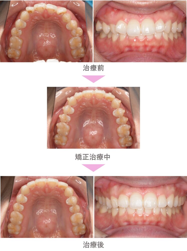 インビザライン矯正(マウスピース矯正)の症例のご紹介です。この患者様は、神奈川県鎌倉市からご来院の20代女性で、すきっ歯(空隙歯列)の症状の症状がありました。治療法はインビザライン矯正。非抜歯で矯正治療を行い、キレイな歯並びになりました。治療期間は7か月です。
