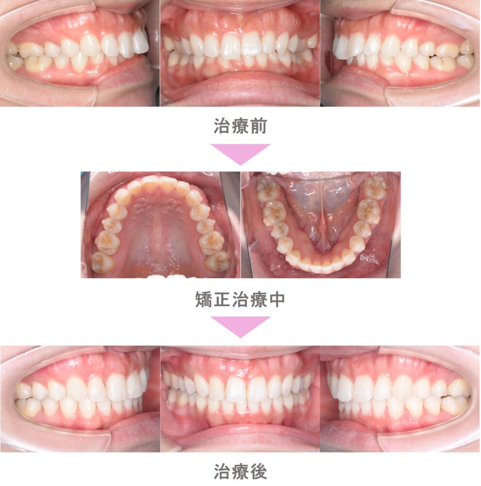 インビザライン矯正(マウスピース矯正)の症例のご紹介です。この患者様は、神奈川県横浜市からご来院の70代女性で、叢生(前歯のでこぼこ)の症状がありました。治療法はインビザライン矯正。非抜歯で矯正治療を行い、キレイな歯並びになりました。治療期間は1年1か月です。