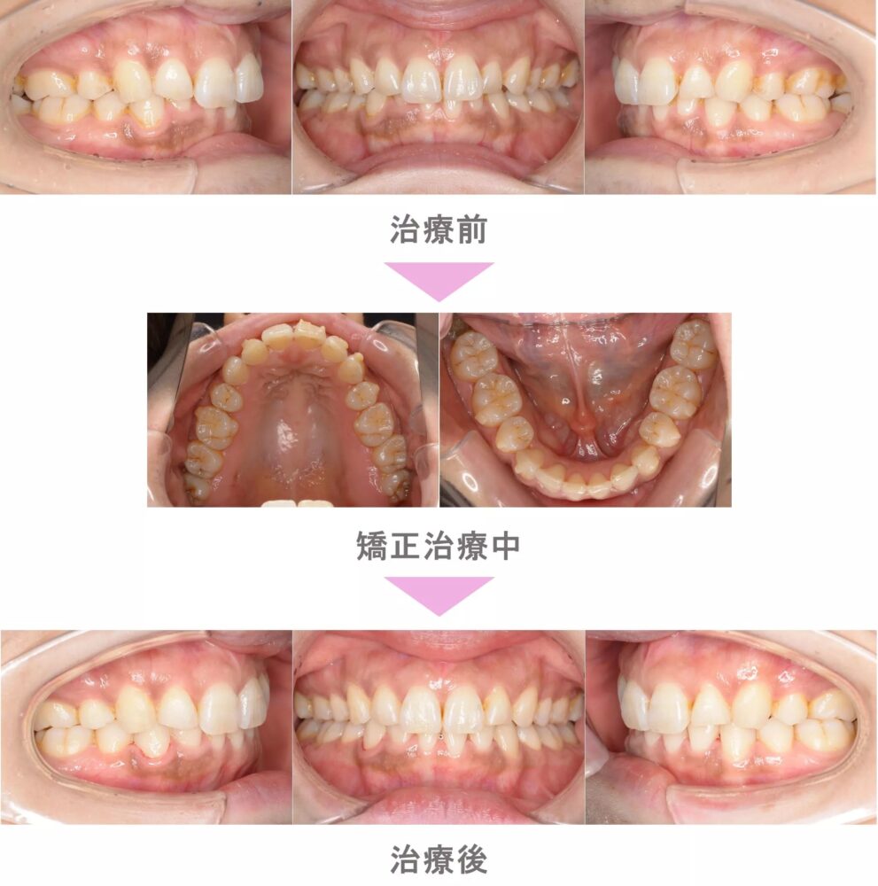 インビザライン矯正(マウスピース矯正)の症例のご紹介です。この患者様は、神奈川県横浜市からご来院の40代女性で、開咬(オープンバイト)と叢生(前歯のでこぼこ)と出っ歯(上顎前突)の症状がありました。治療法はインビザラインライト矯正。非抜歯で矯正治療を行い、キレイな歯並びになりました。治療期間は10か月です。
