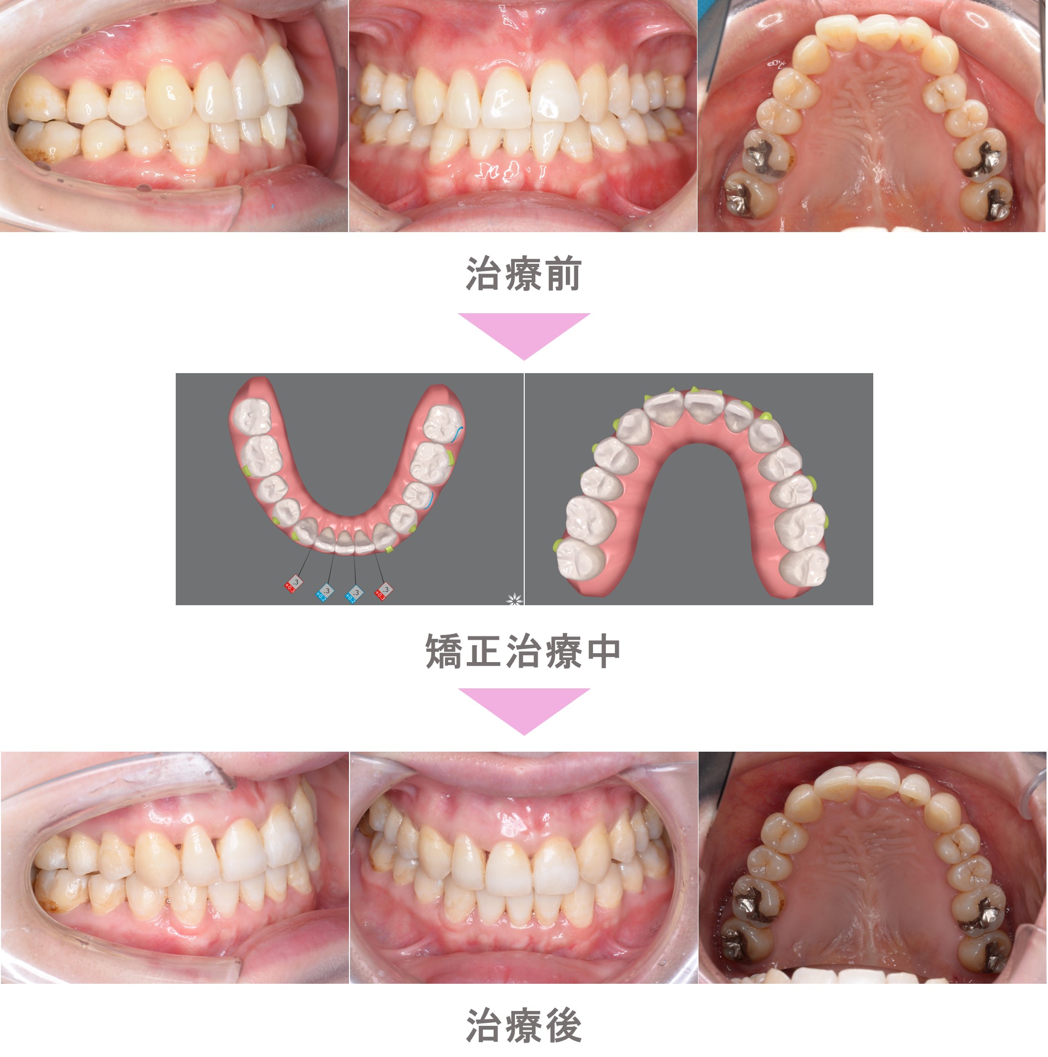 インビザライン矯正(マウスピース矯正)の症例紹介|叢生(前歯のでこぼこ)の症状|非抜歯による矯正治療|治療期間は1年6か月(東京都品川区・30代女性 )