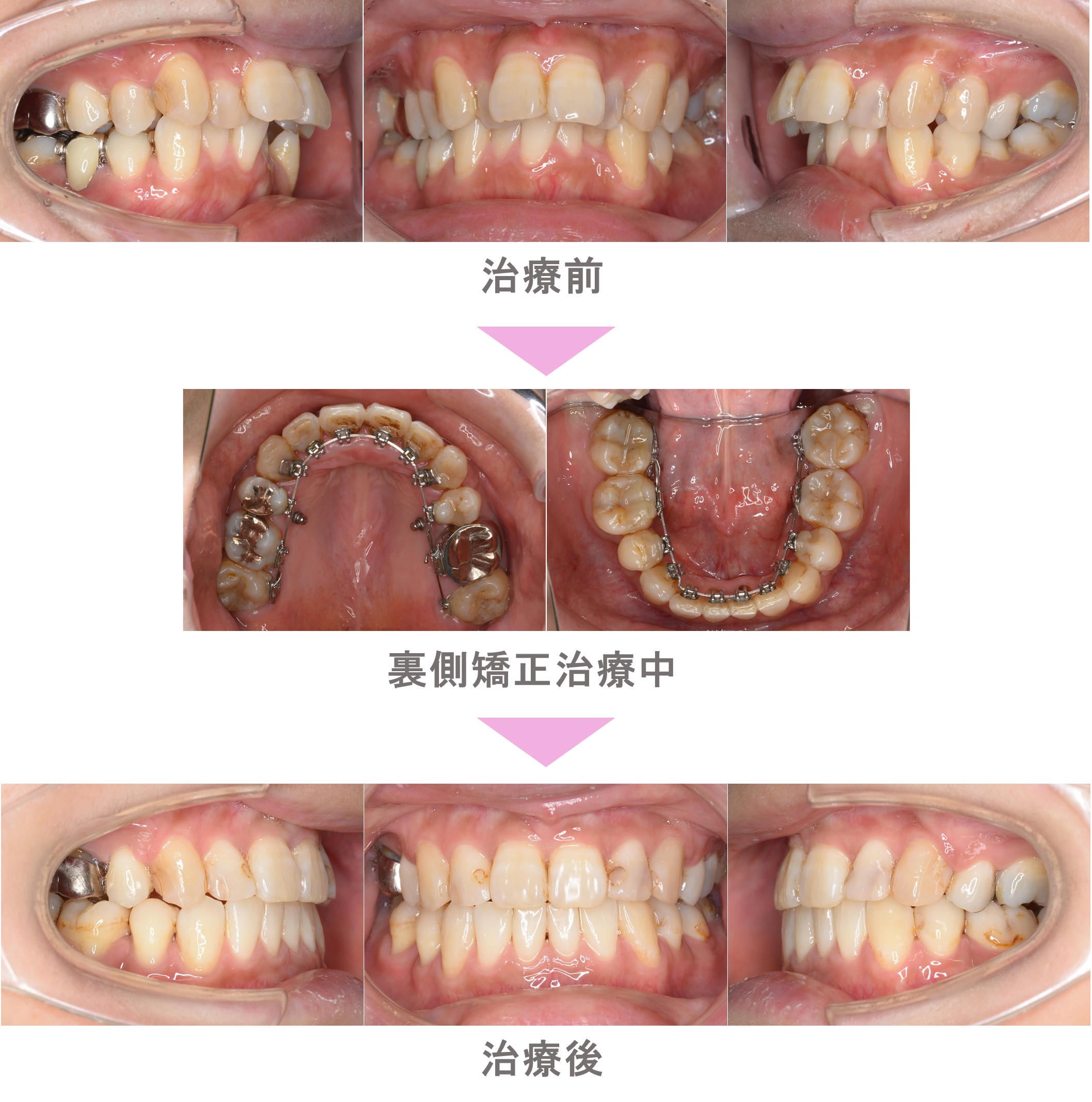 裏側矯正(舌側矯正)の症例紹介|出っ歯(上顎前突)と叢生(前歯のでこぼこ)の症状|抜歯による矯正治療|治療期間は2年6か月(東京都世田谷区・30代女性 )