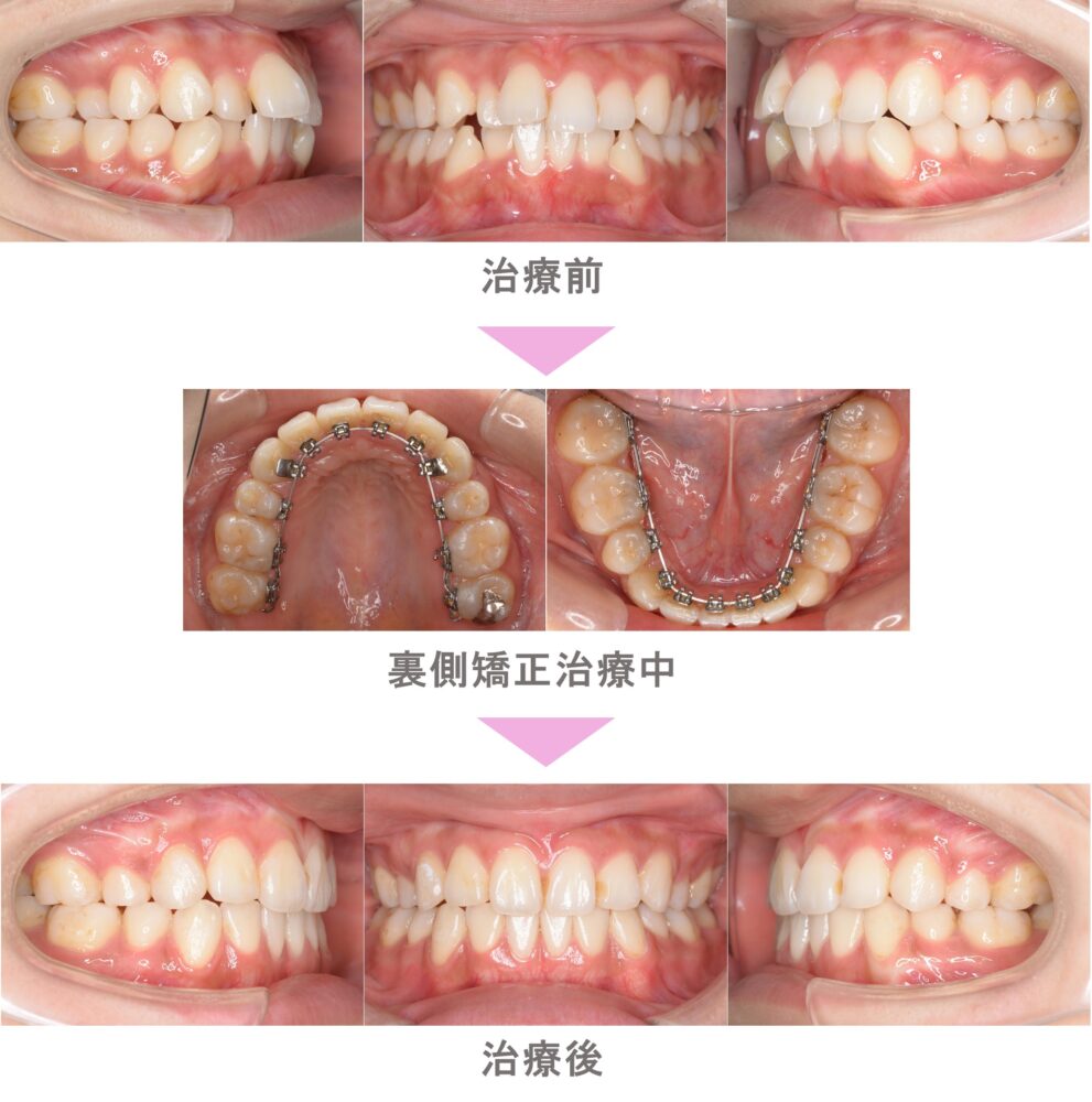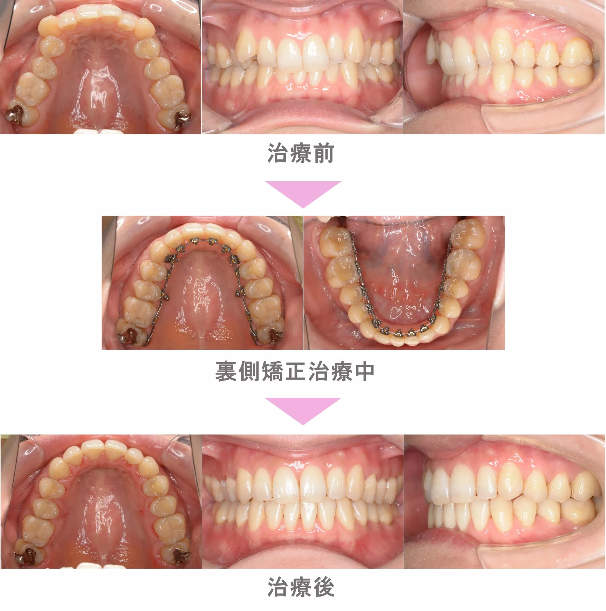 裏側矯正(舌側矯正)の症例紹介|過蓋咬合(深噛み)と八重歯(犬歯突出)の症状|非抜歯による矯正治療|治療期間は1年10か月(東京都世田谷区・30代女性 )