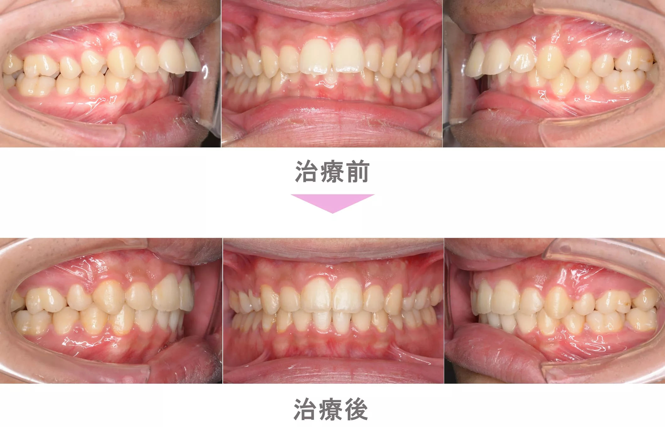 裏側矯正(舌側矯正)の症例のご紹介です。この患者様は、東京都世田谷区内からご来院の大学生男子で、叢生(前歯のでこぼこ)と出っ歯(上顎前突)の症状がありました。治療法は裏側矯正(舌側矯正)。3本抜歯で矯正治療を行い、キレイな歯並びになりました。治療期間は1年9か月です。