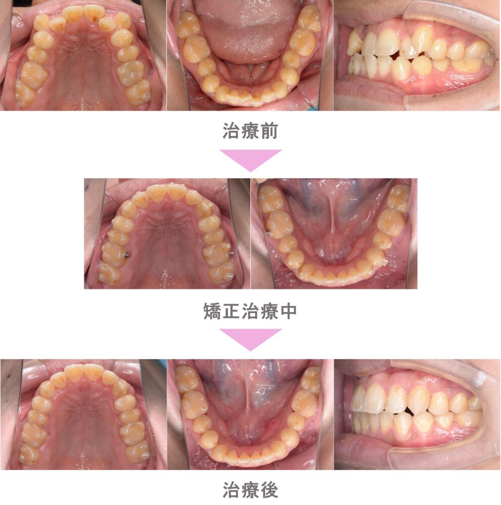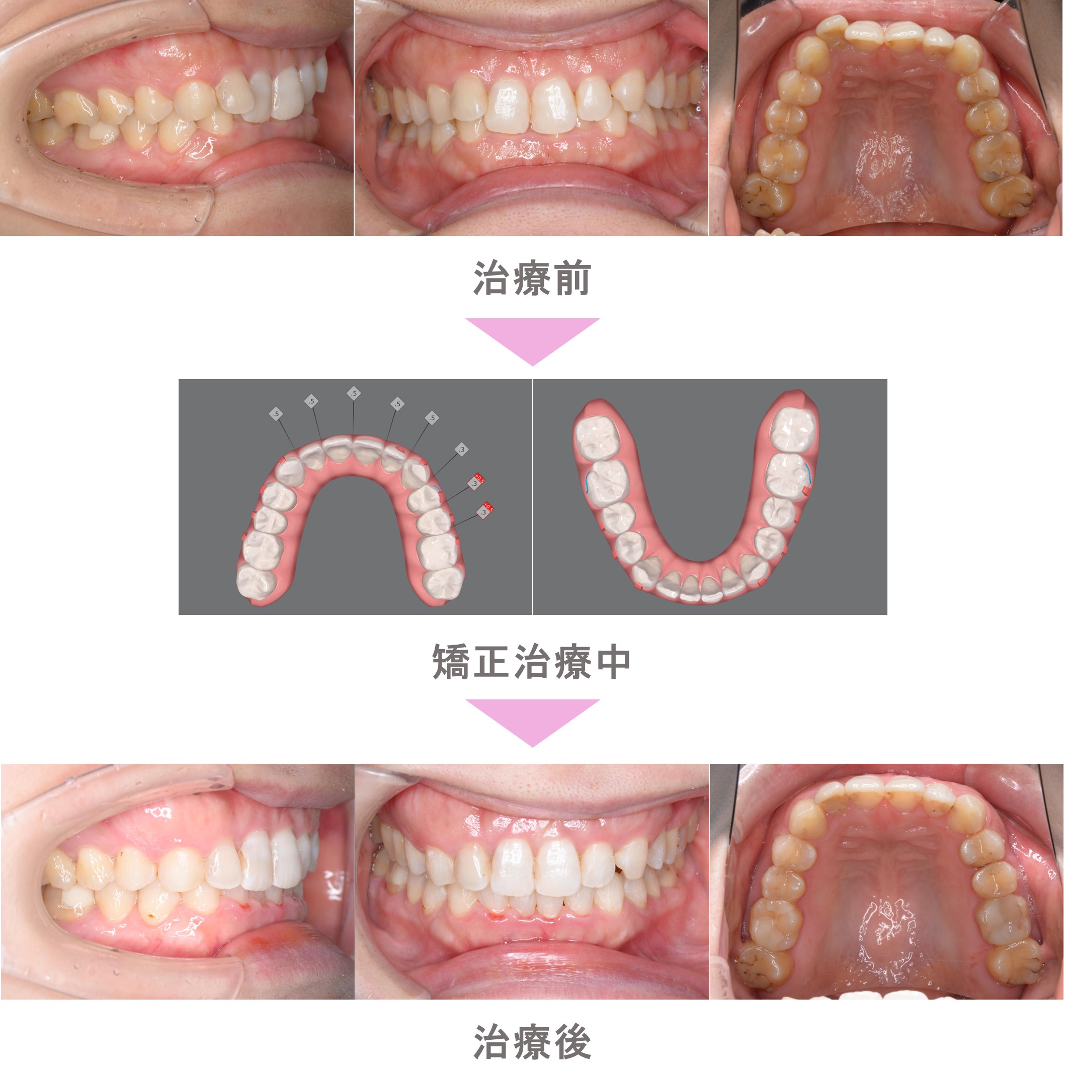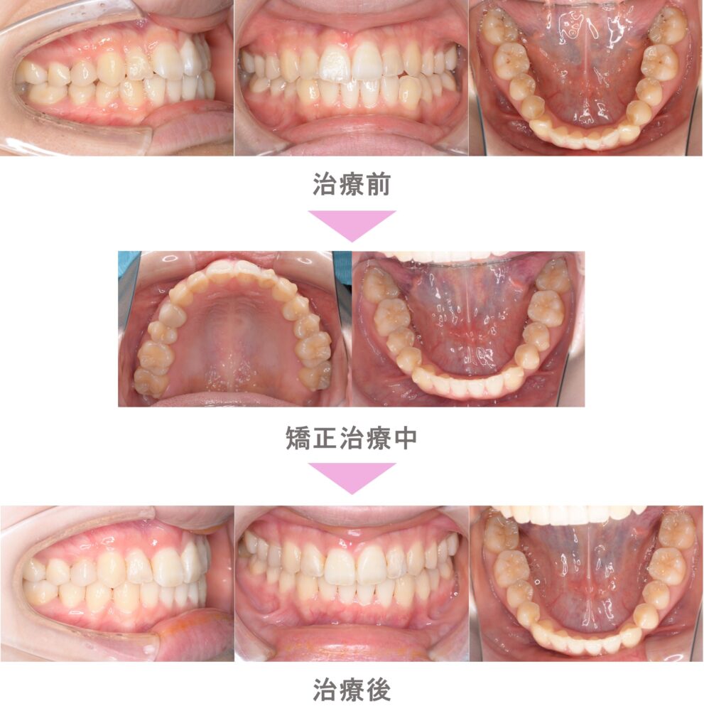 インビザライン矯正(マウスピース矯正)の症例紹介|叢生(前歯のでこぼこ)と過蓋咬合(深噛み)の症状|非抜歯による矯正治療|治療期間は2年(東京都品川区・30代女性 )